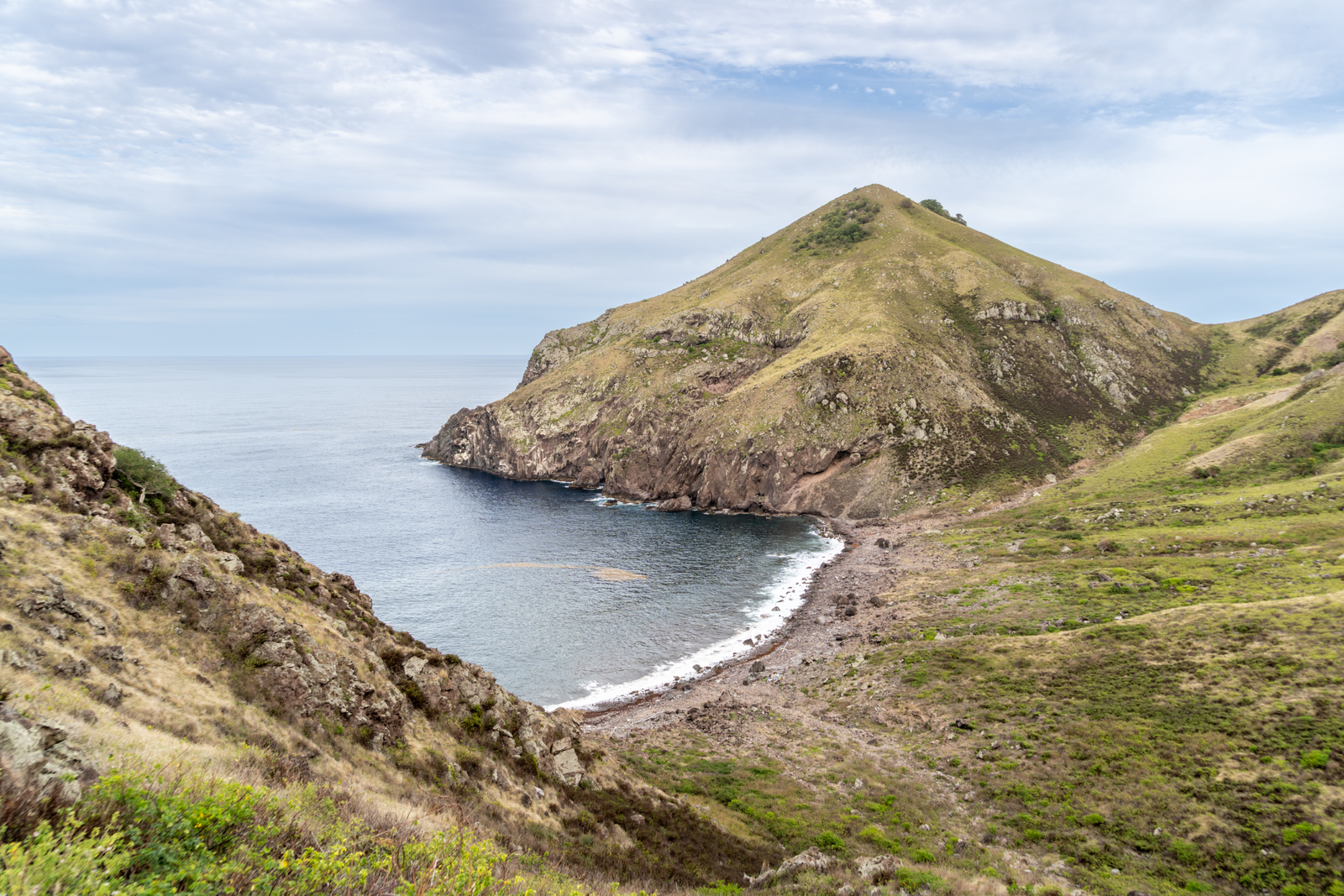 Het strand van Spring Bay met Old Booby Hill op de a...