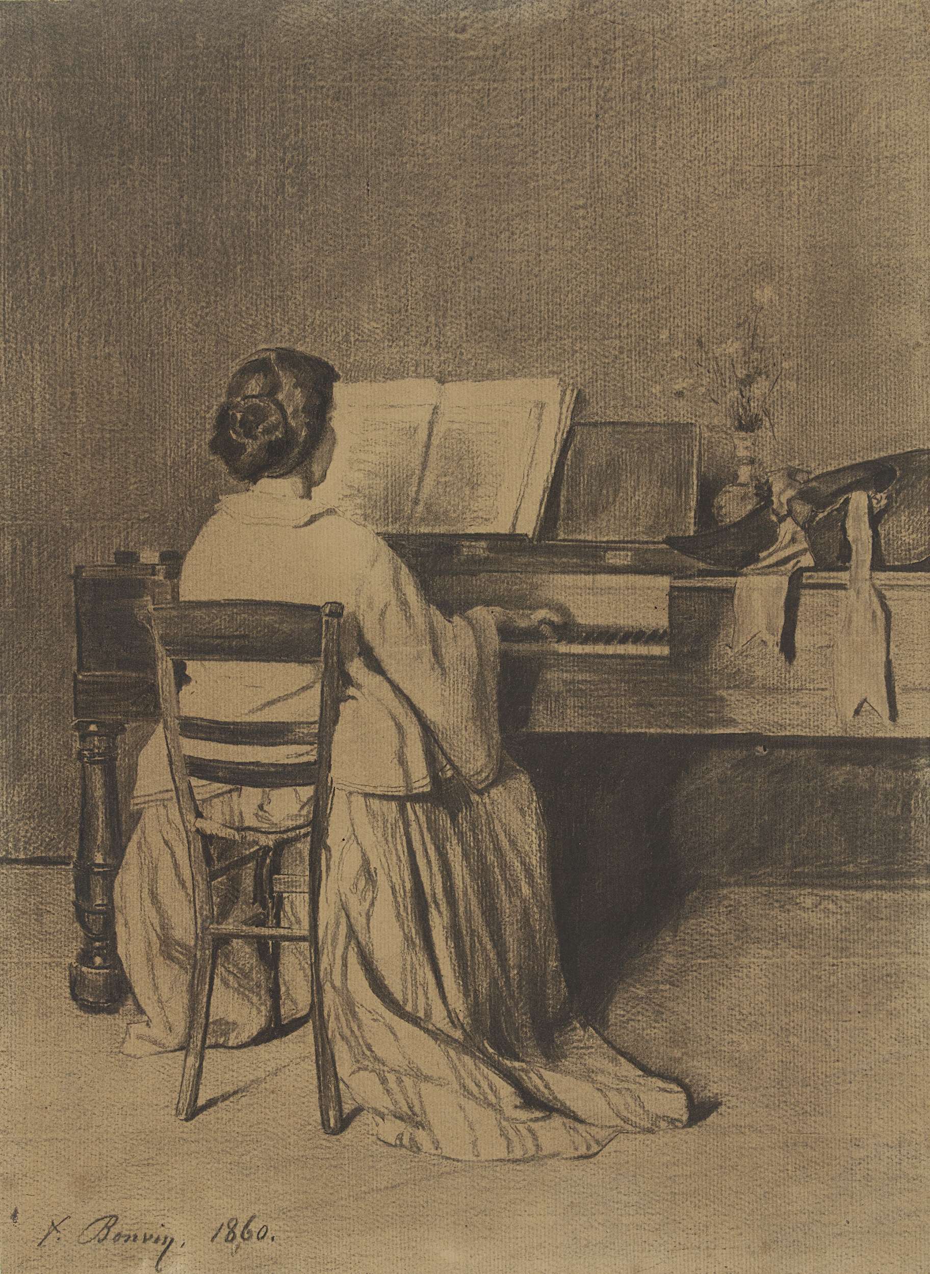 Vrouw aan de piano, op de rug gezien
