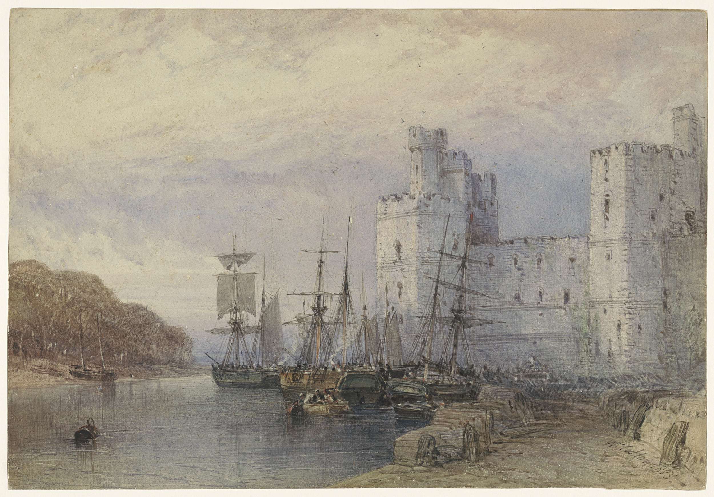 Landschap met schepen voor Caernarvon Castle