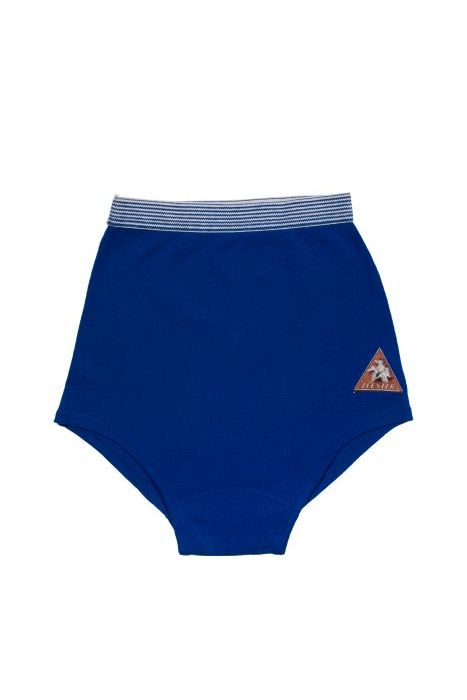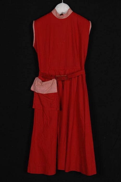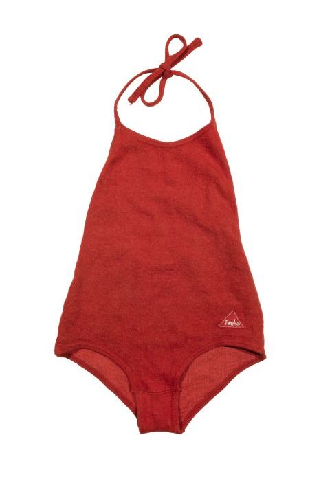 Kinderbadpak van rood tricot wol, strikband bij de h...