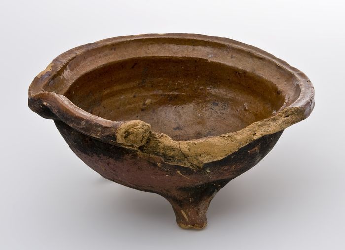 Aardewerk steelpan op drie poten, schenklip, komvorm...