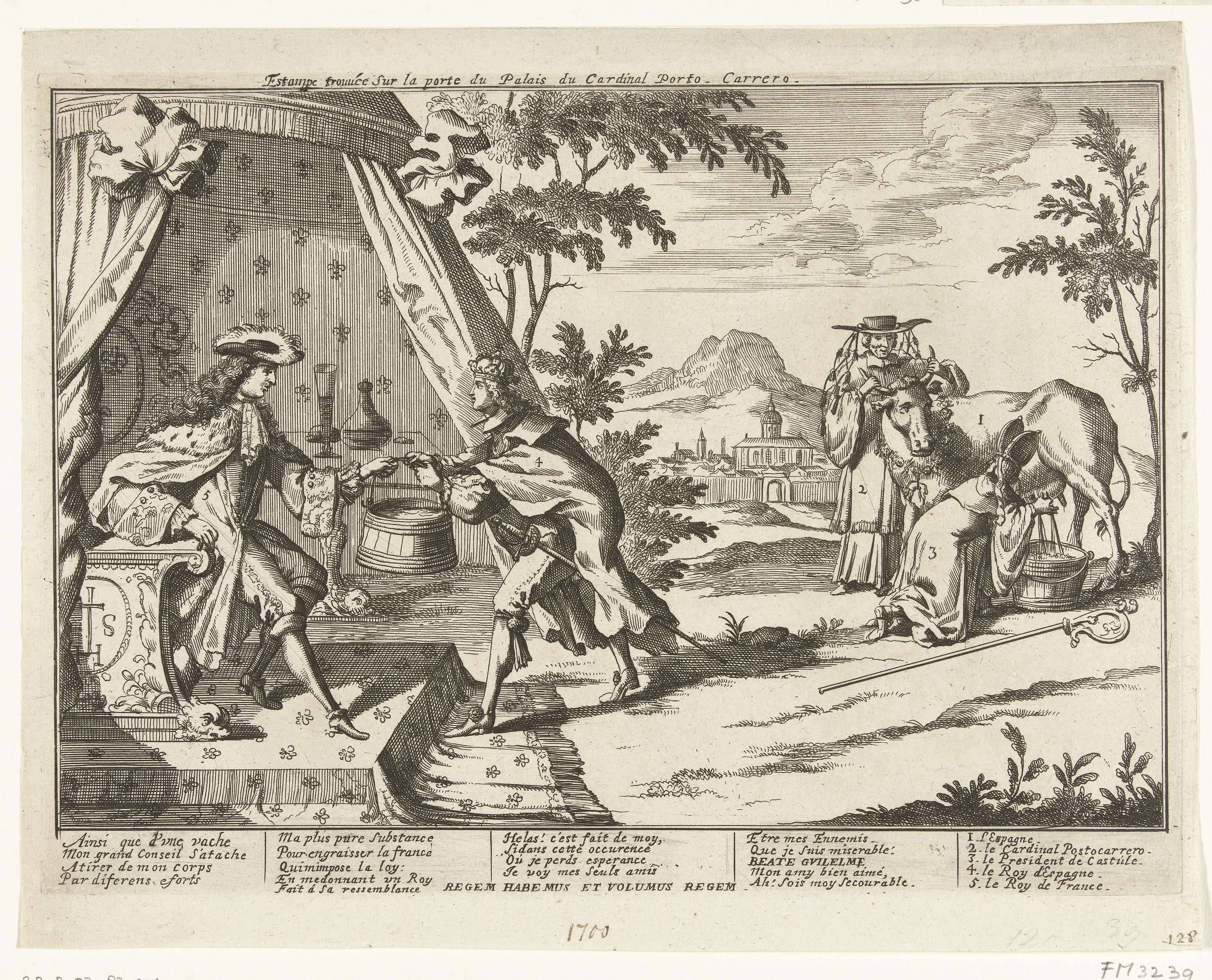 Het melken van de Spaanse koe, ca. 1701
