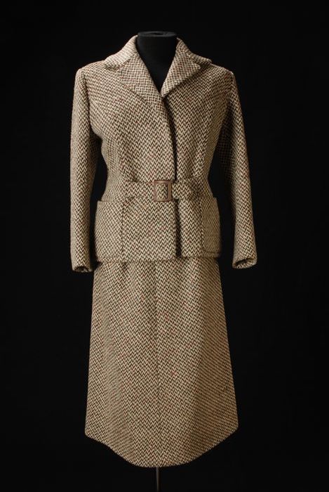 Bruin mantelpak, knielange rok en bijbehorend jasje ...