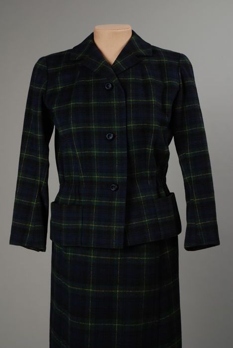 Donker geruit mantelpak, knielange rok en bijbehoren...