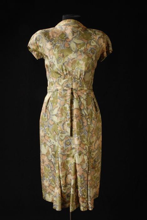 Knielange zijden japon met vlekkerig dessin in groen...