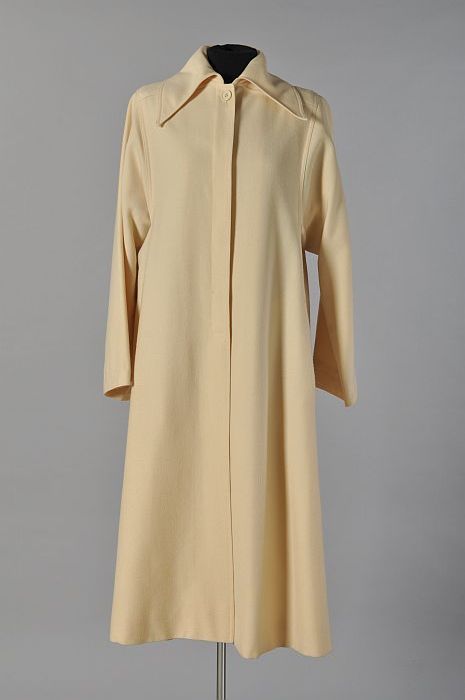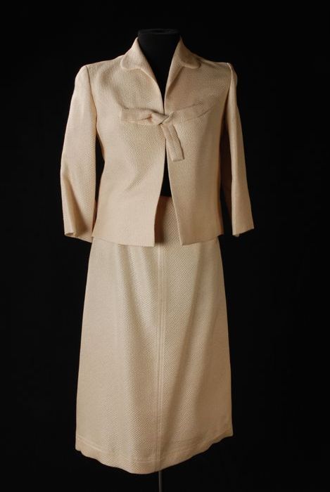 Ivoorkleurig mantelpak, knielange rok en bijpassend ...