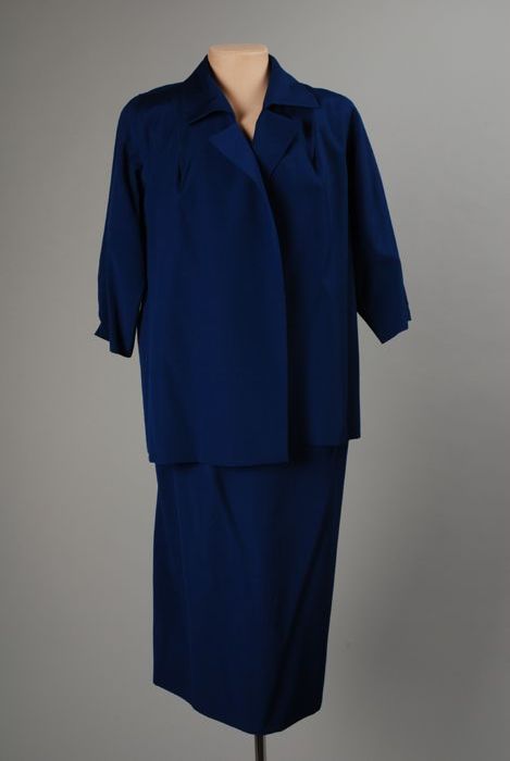 Donkerblauw mantelpak, knielange rok met jasje