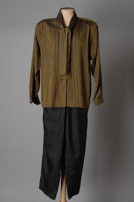 Ruime blouse met strikkraag, goudgeel en zwart stree...