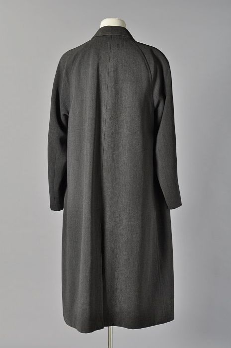Donker mantelpak, knielange rok en lange jas