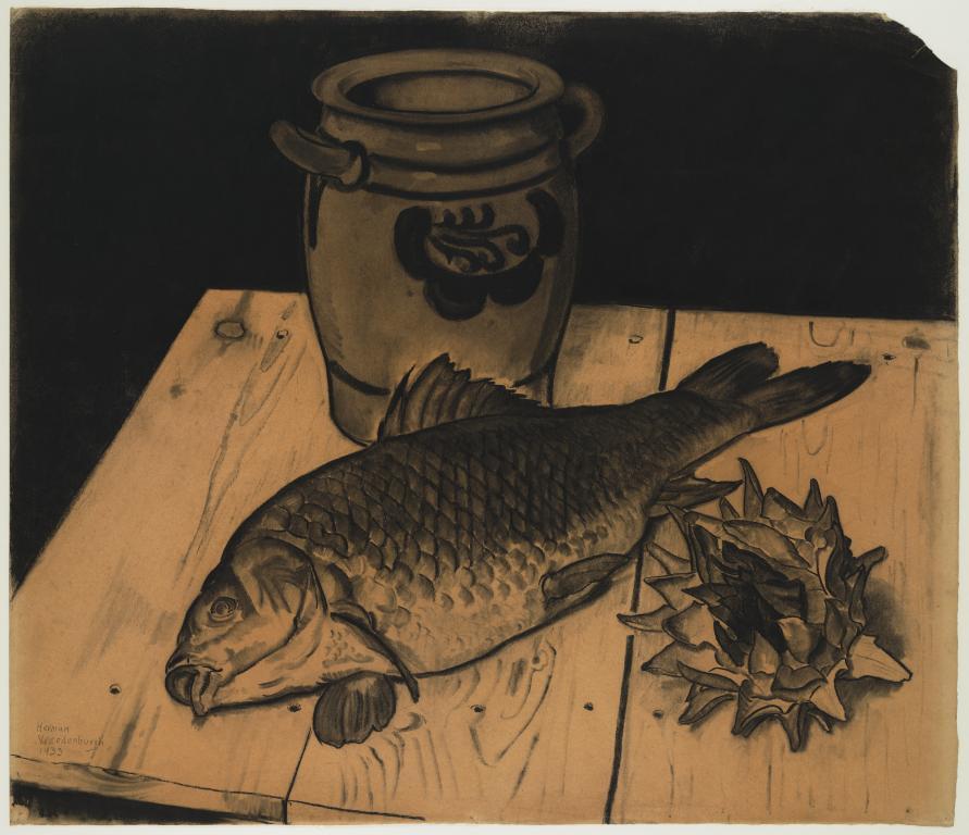 Stilleven met een vis, een pot en arisjok op een hou...