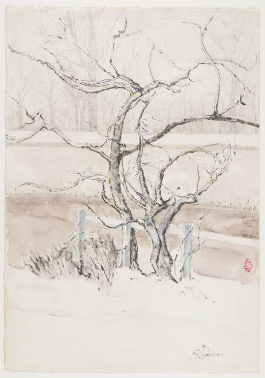 Twee bomen op de voorgrond met eronder een wit hek, ...