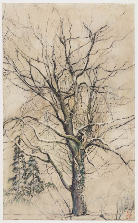 Grote boom in de winter, met links twee naaldbomen