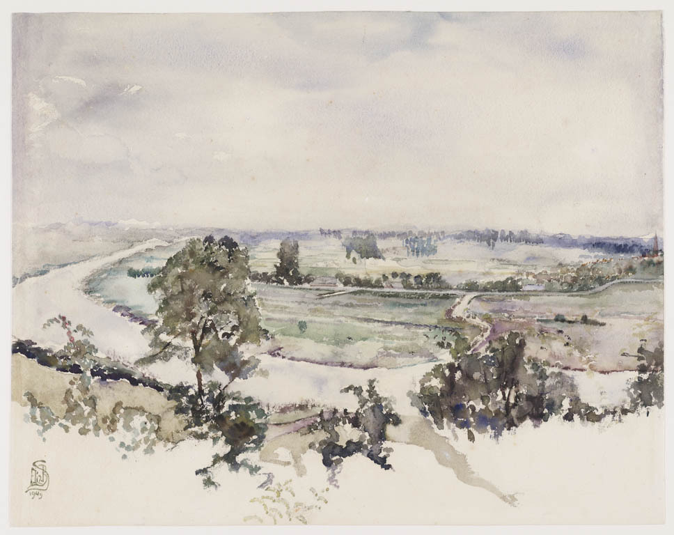 Landschap met grote rivier, velden en bomen, gezien ...