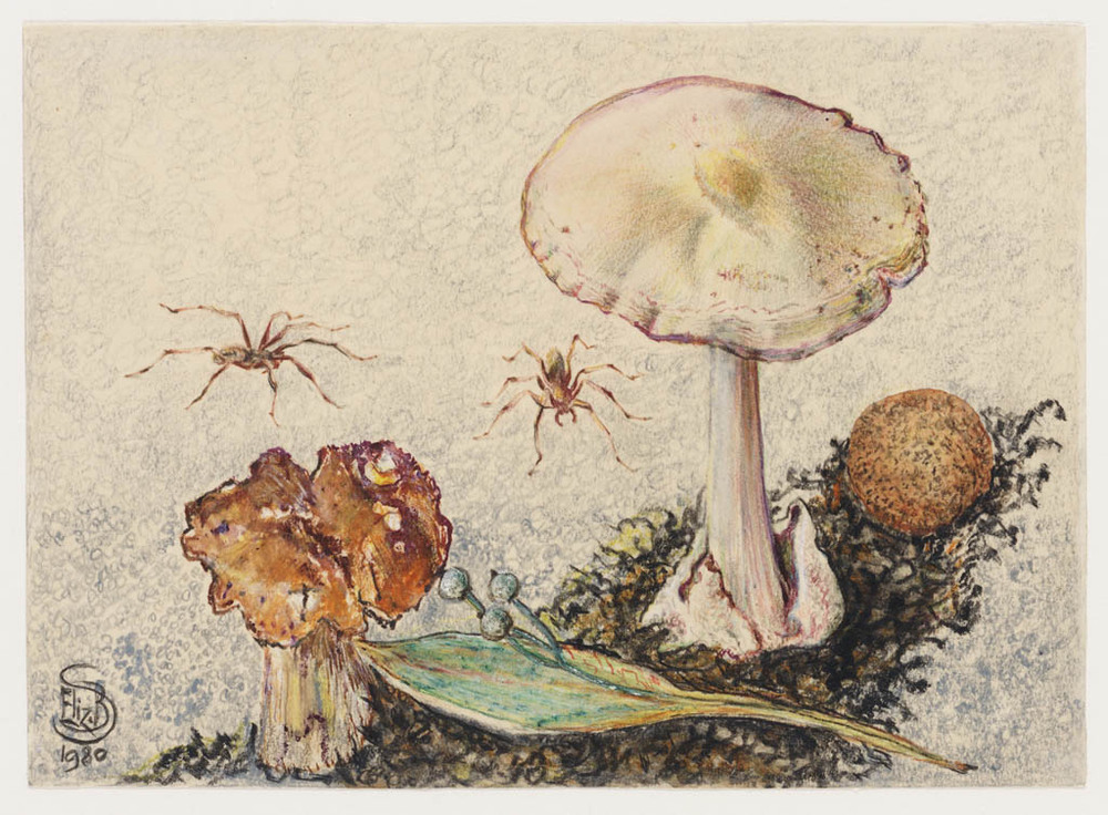 Twee spinnen bij paddestoelen en mos