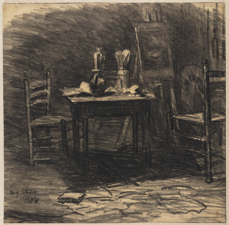 Atelier met schildersezel, tafel en twee stoelen
