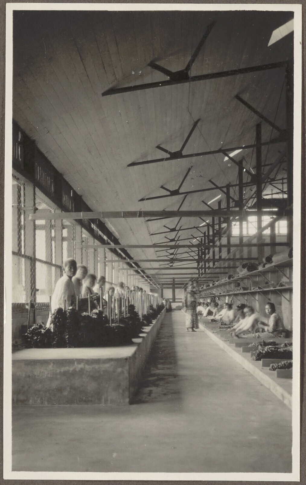 Contract labourers in a fermenting shed on a tobacco...