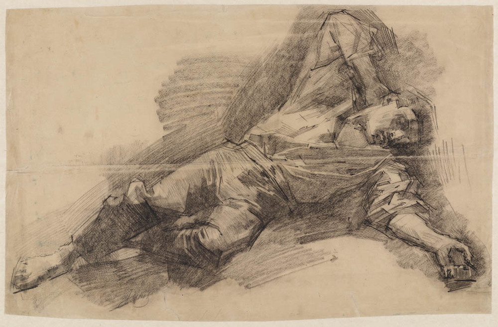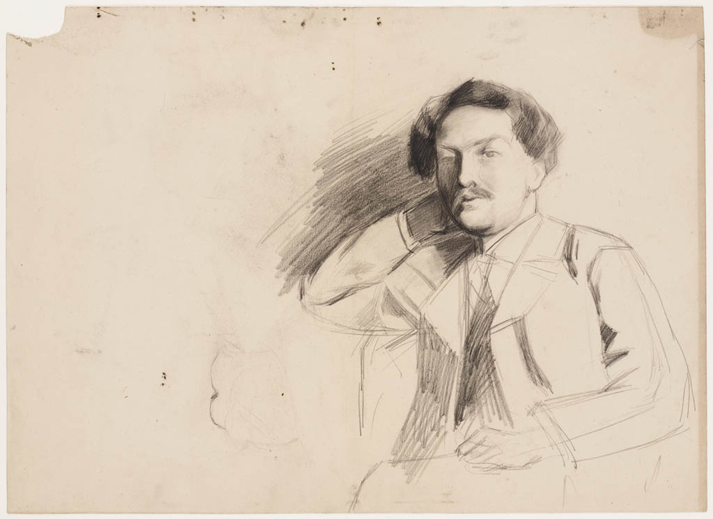 Schets van een zittende man schuin van voren, de rec...