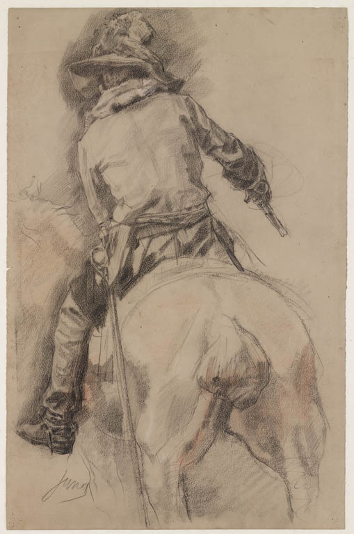Ruiter in historisch kostuum, pistool in de rechterh...
