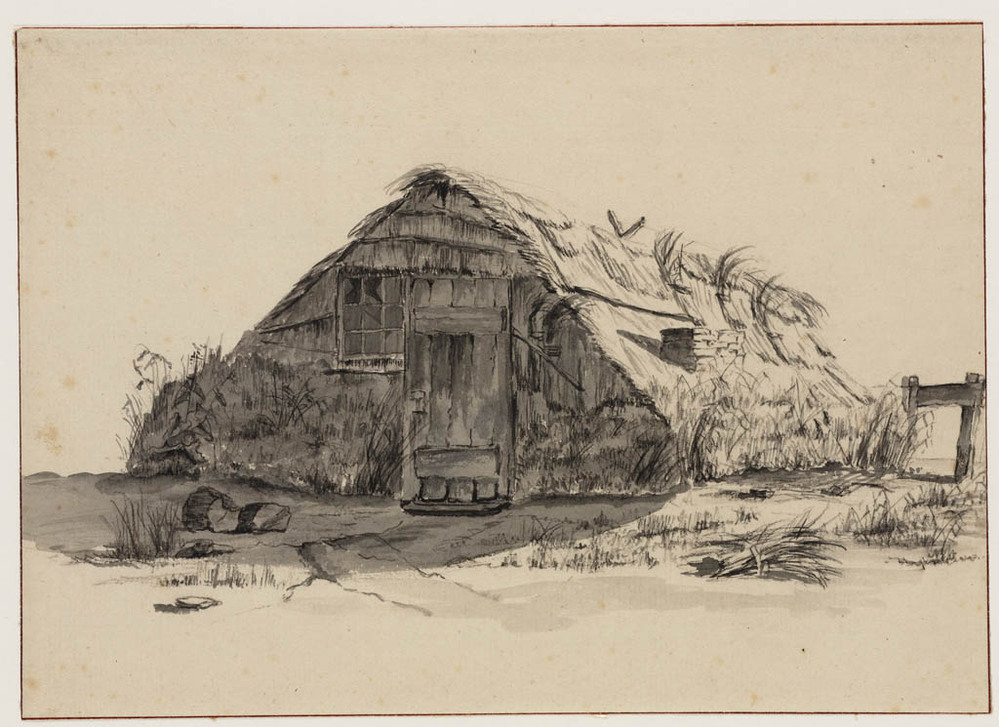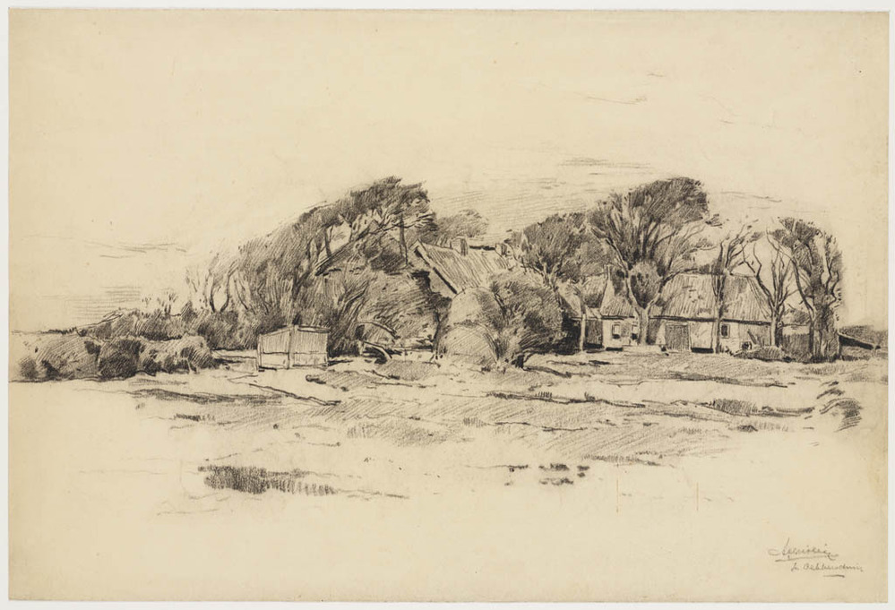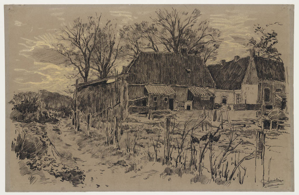 Duin- of heidelandschap met rechts een huis tussen b...