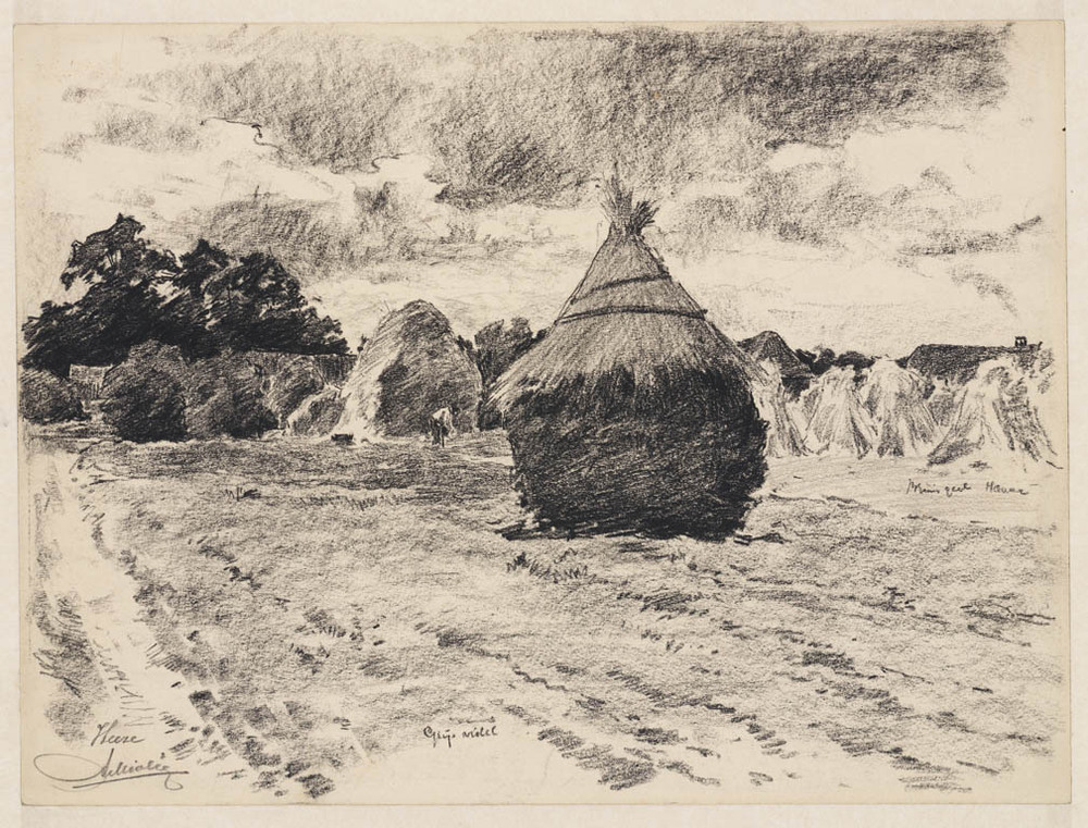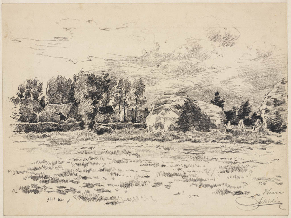 Veld met hooischelven met erachter boerderijen tusse...