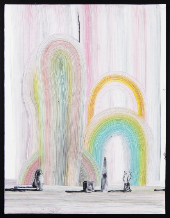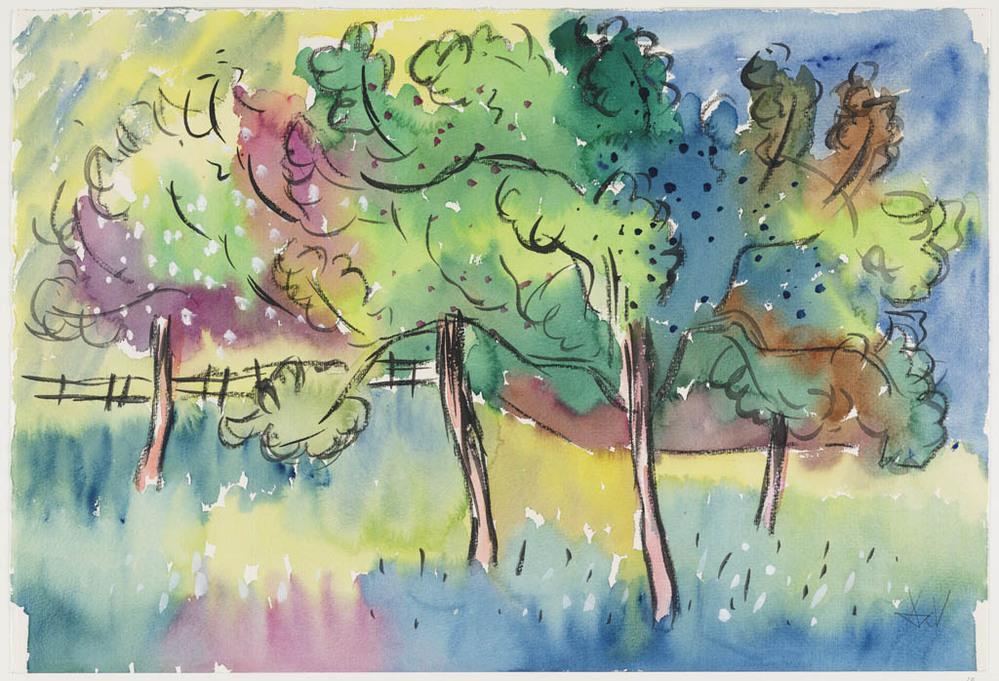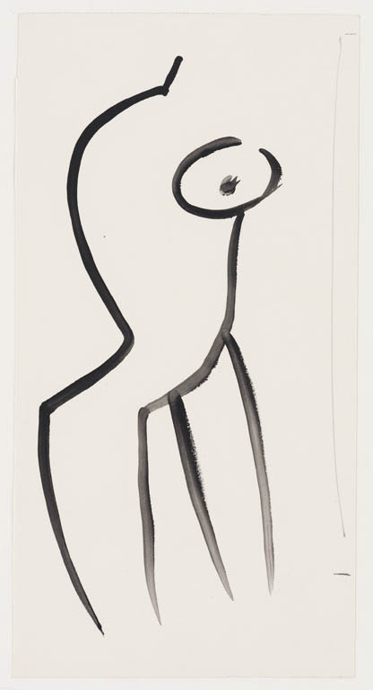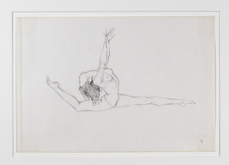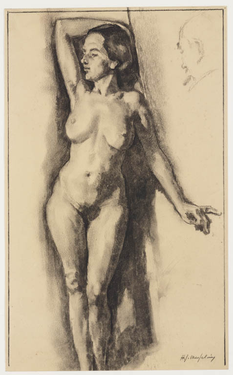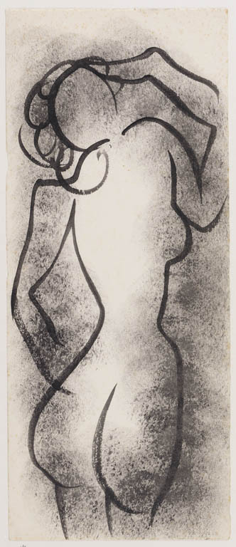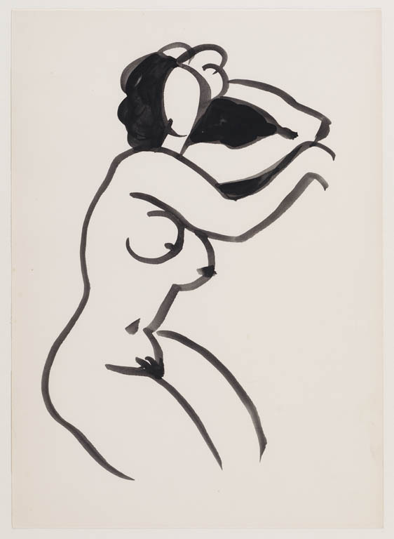 Zittend vrouwelijk naakt, de armen boven het hoofd g...
