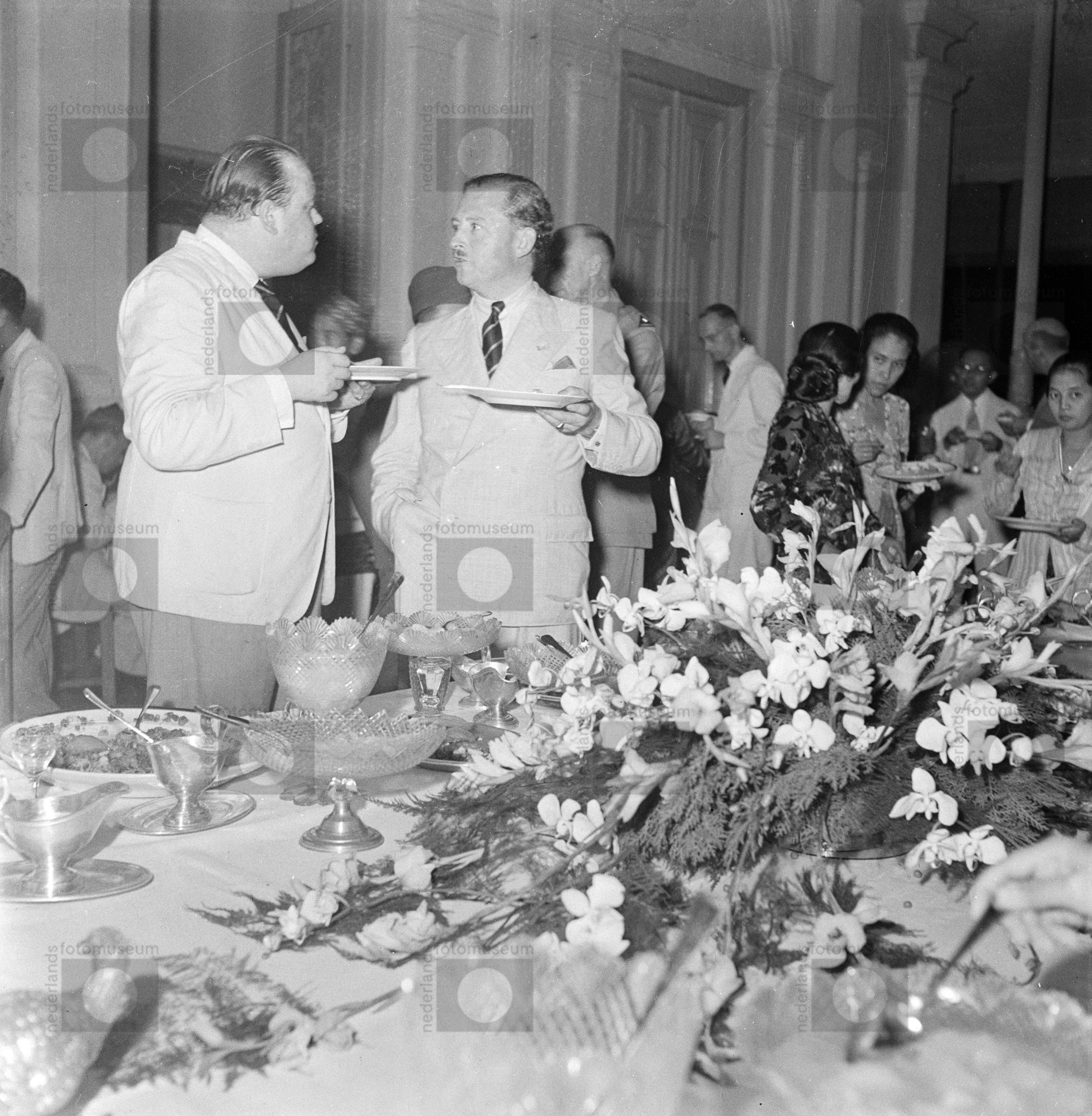 Twee Nederlandse delegatieleden bij het buffet tijde...