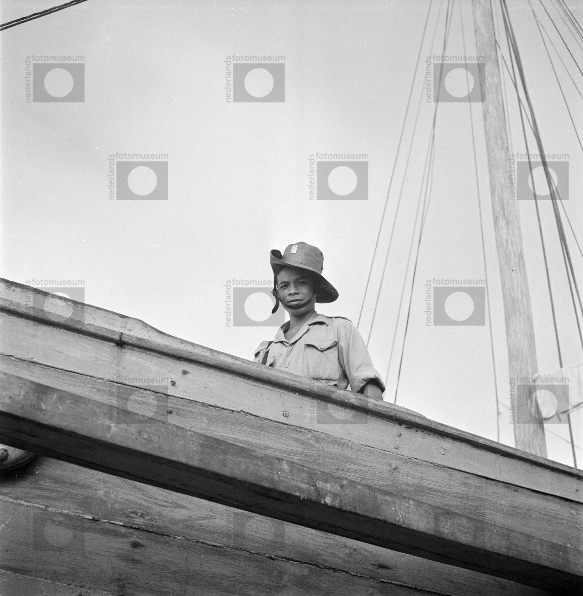 KNIL-militair bewaakt een binnenvaartschip in een ri...