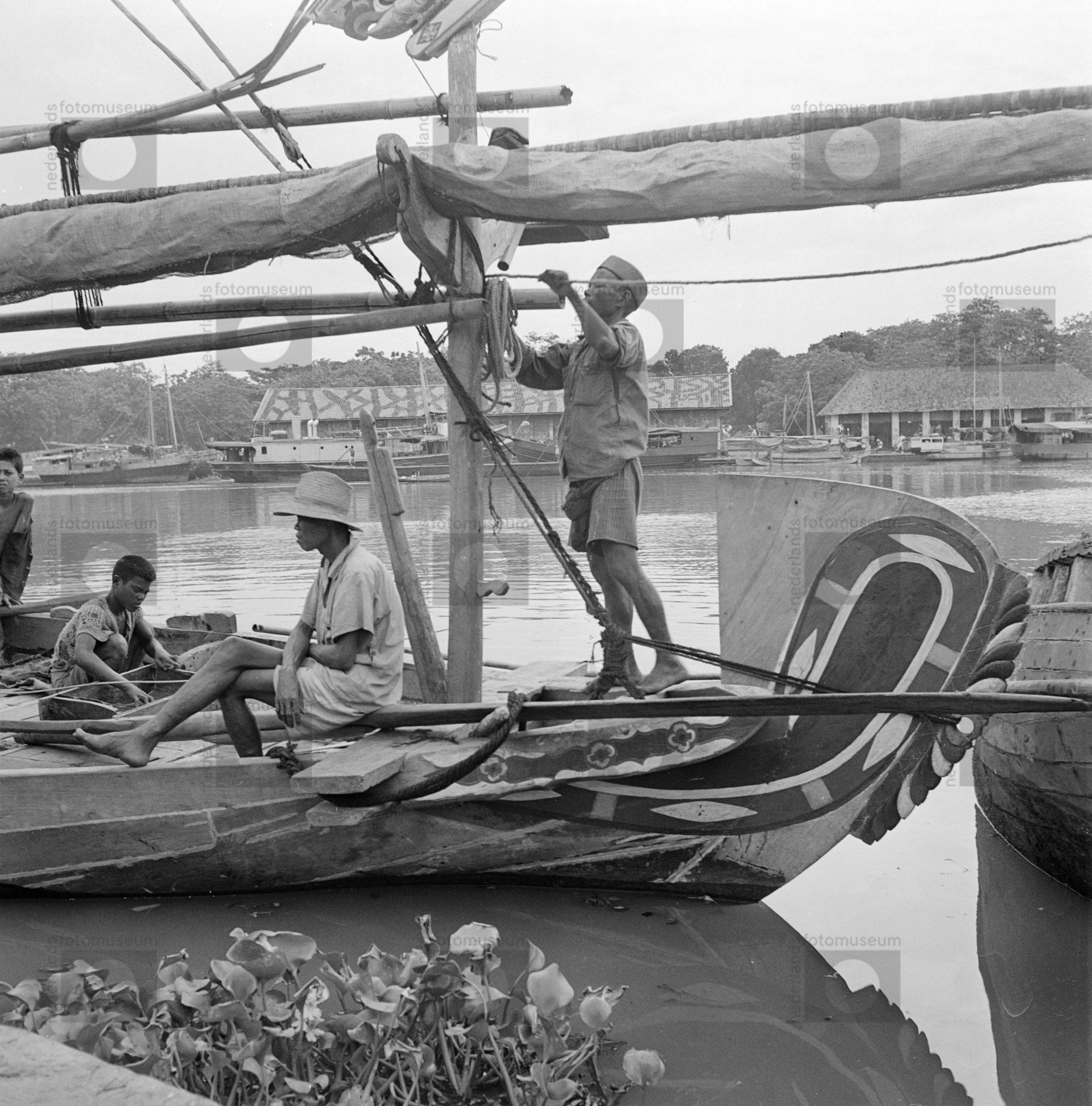 Onderhoud aan een inheemse zeilboot in haven, Indone...