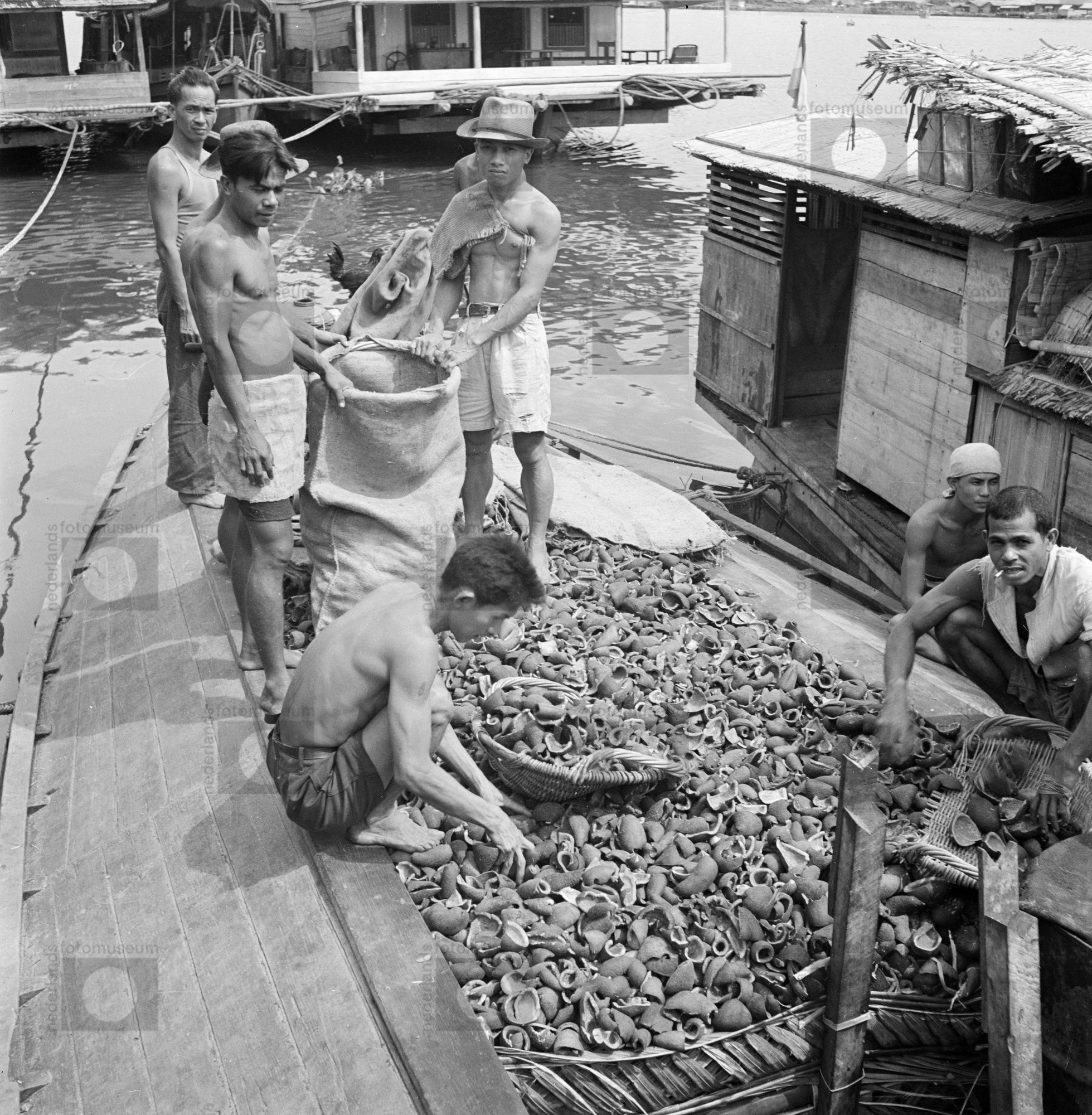 Een groep mannen vult in een binnenhaven op Borneo e...