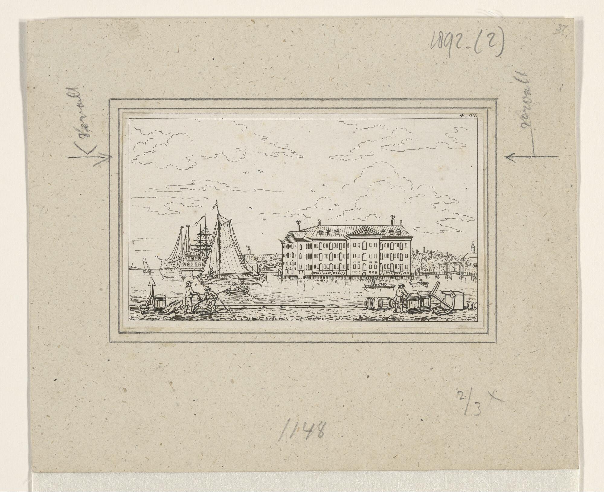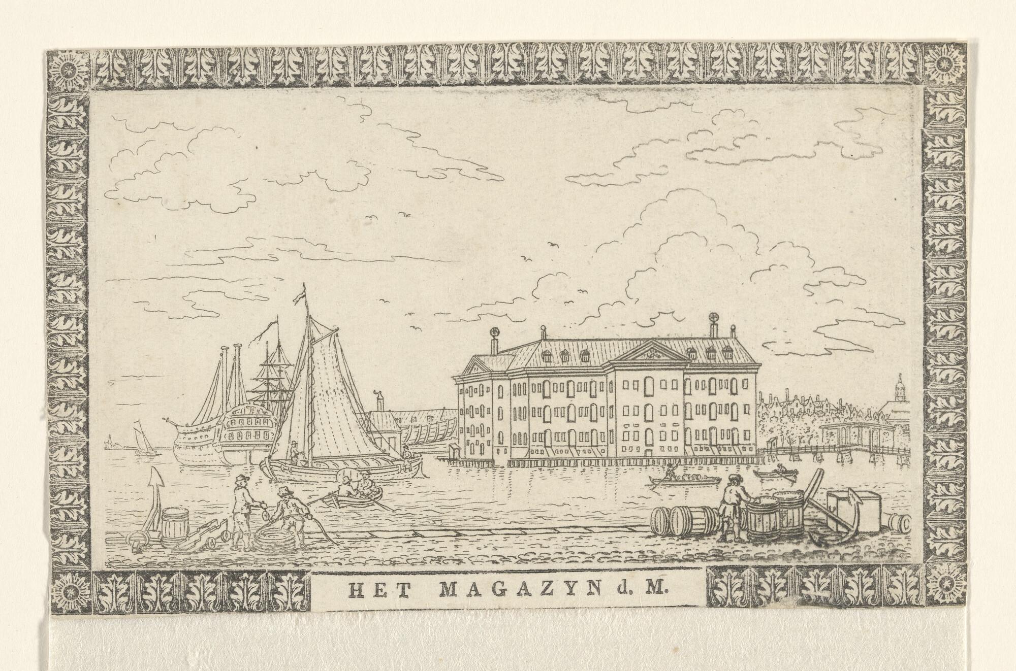 Gezicht op 's Lands Zeemagazijn te Amsterdam met rec...