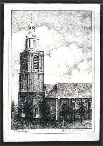 Potloodtekening. Oude Kerk met toren op De Markt Vla...