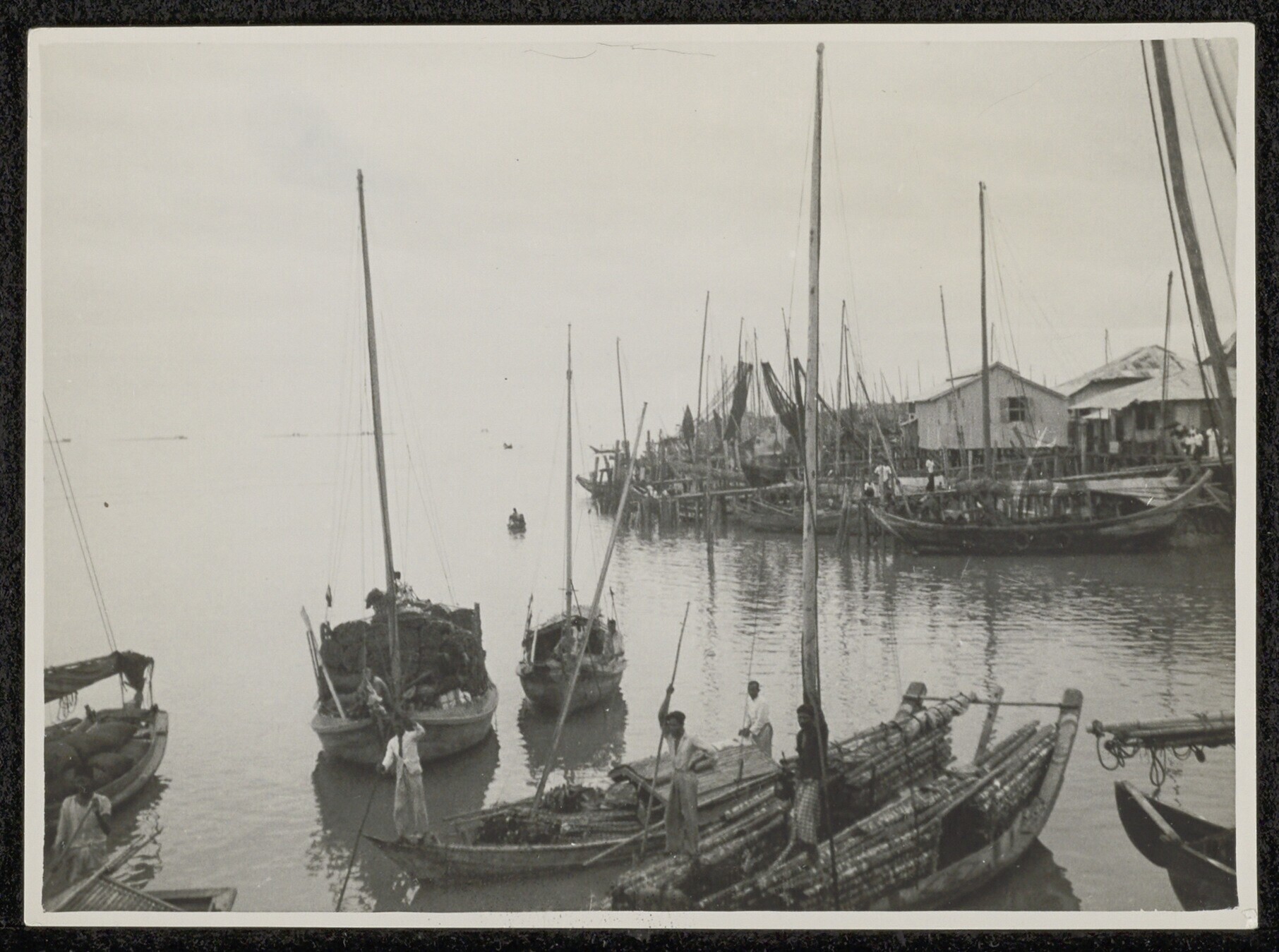 Havengezicht met vrachtvervoerende prauwen in het vi...