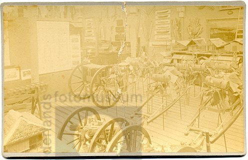 Opstelling met scheepsmodellen, koets en wapens op k...
