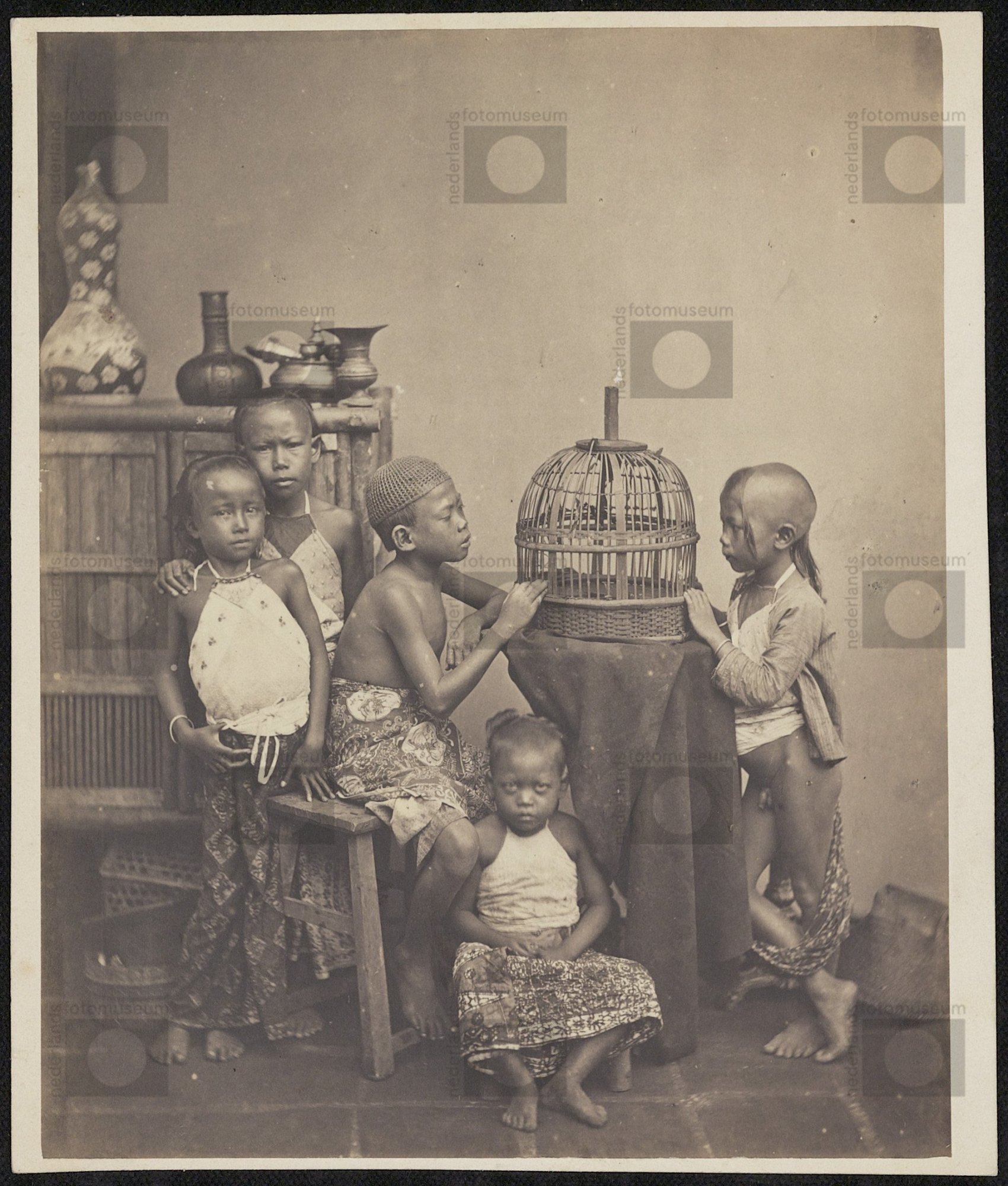 Kinderen bij vogelkooi, Java, Indonesië (ca. 1875)