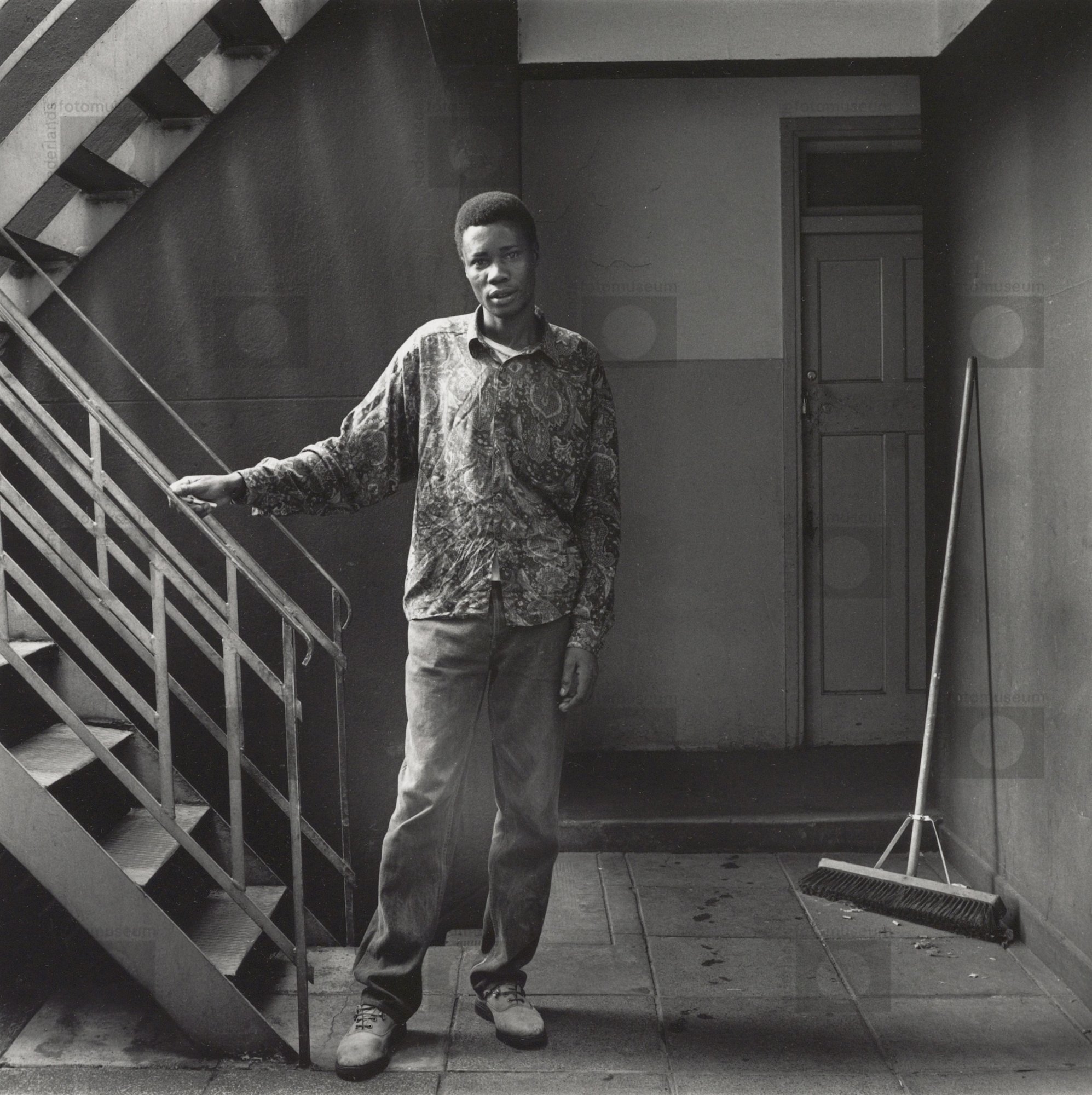 Schoonmaker Emmanuel Ngwenya in het trappenhuis van ...