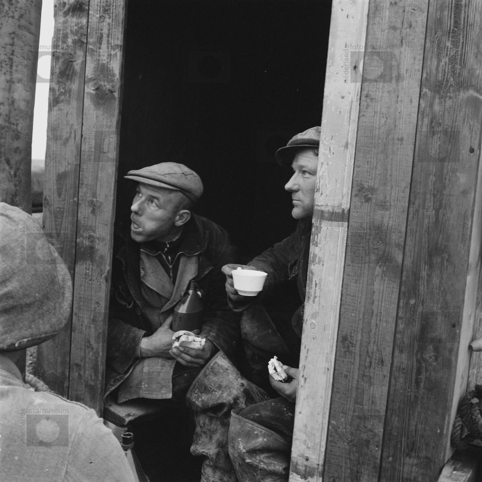 Enkhuizen. Dijkaanleg. Dijkwerkers in de schaftkeet.