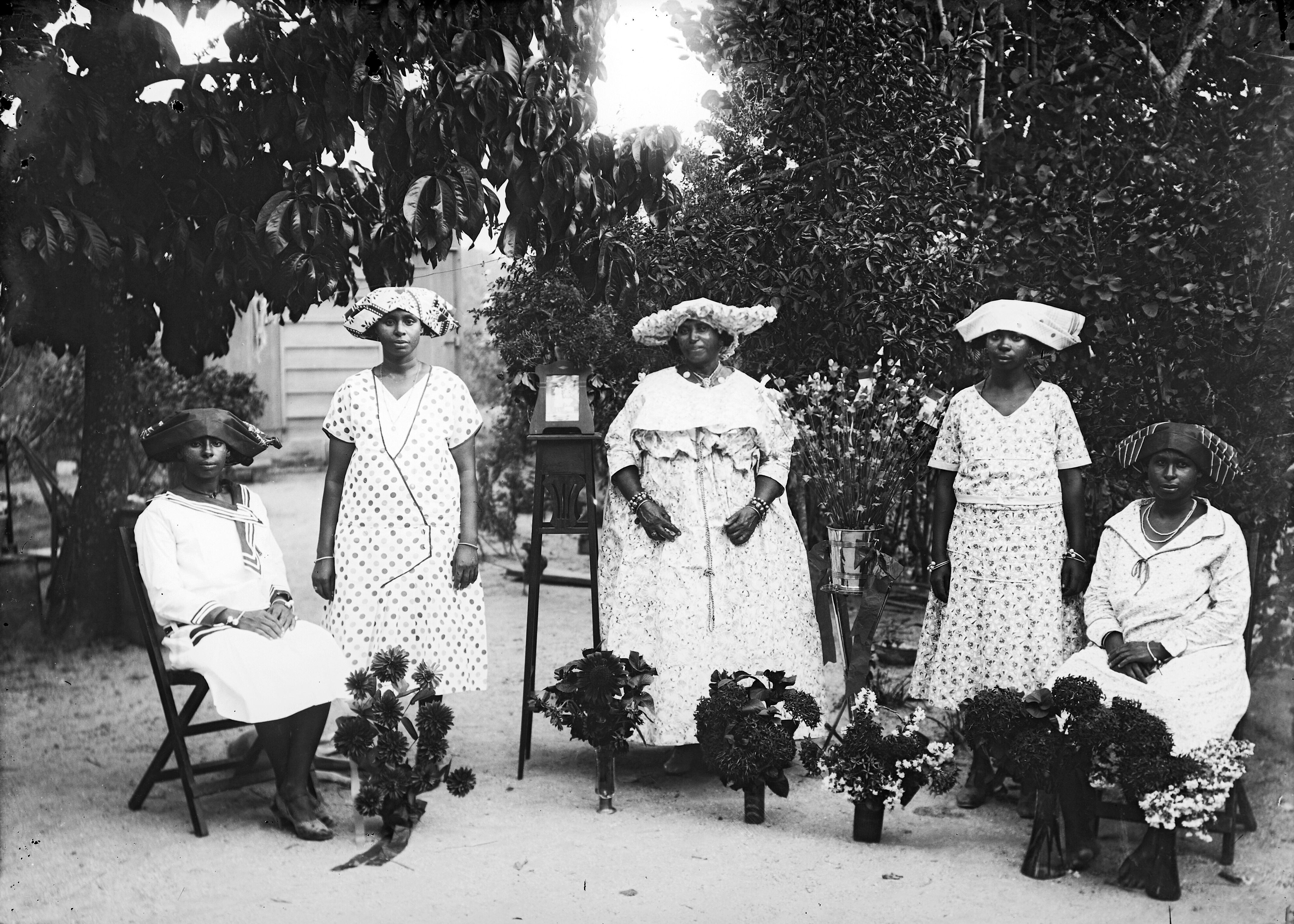 Portret van een groep Creoolse vrouwen gekleed als k...