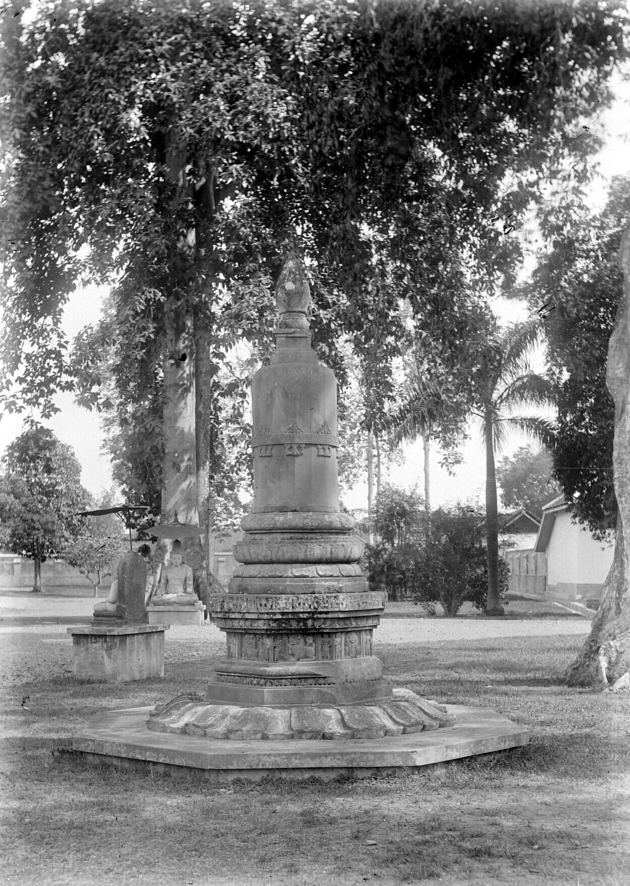 Stupa en Boeddhabeelden in de tuin van de ambtswonin...
