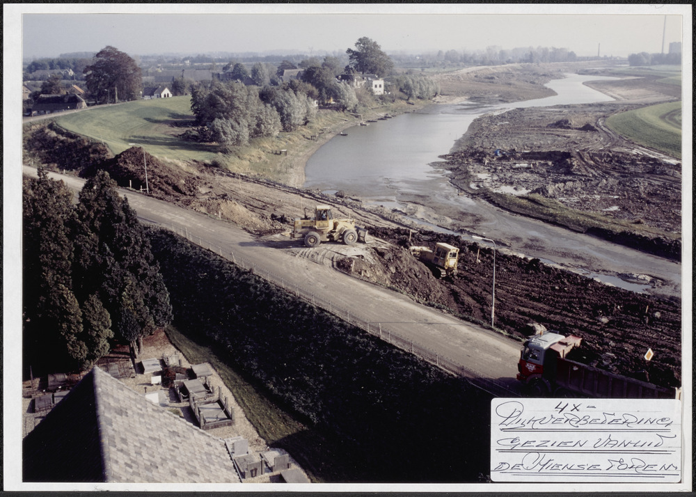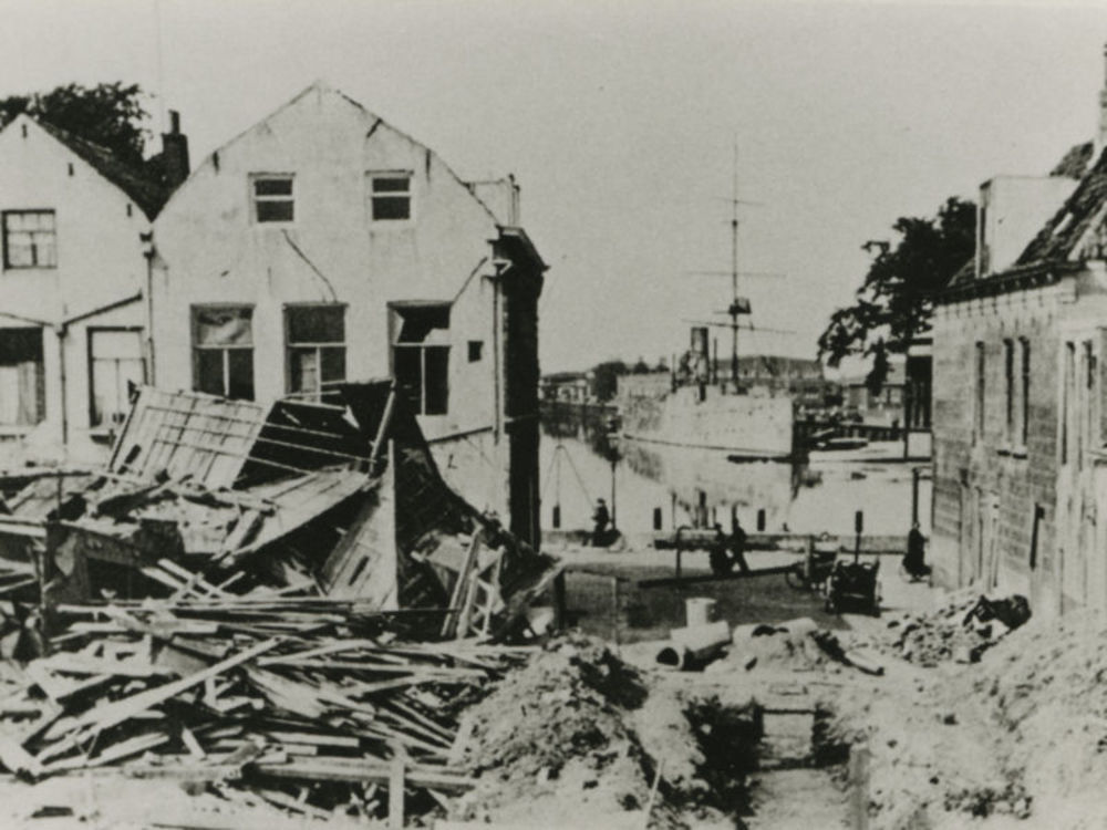 Foto van gesloopte gebouwen. Een kerk staat deels no...