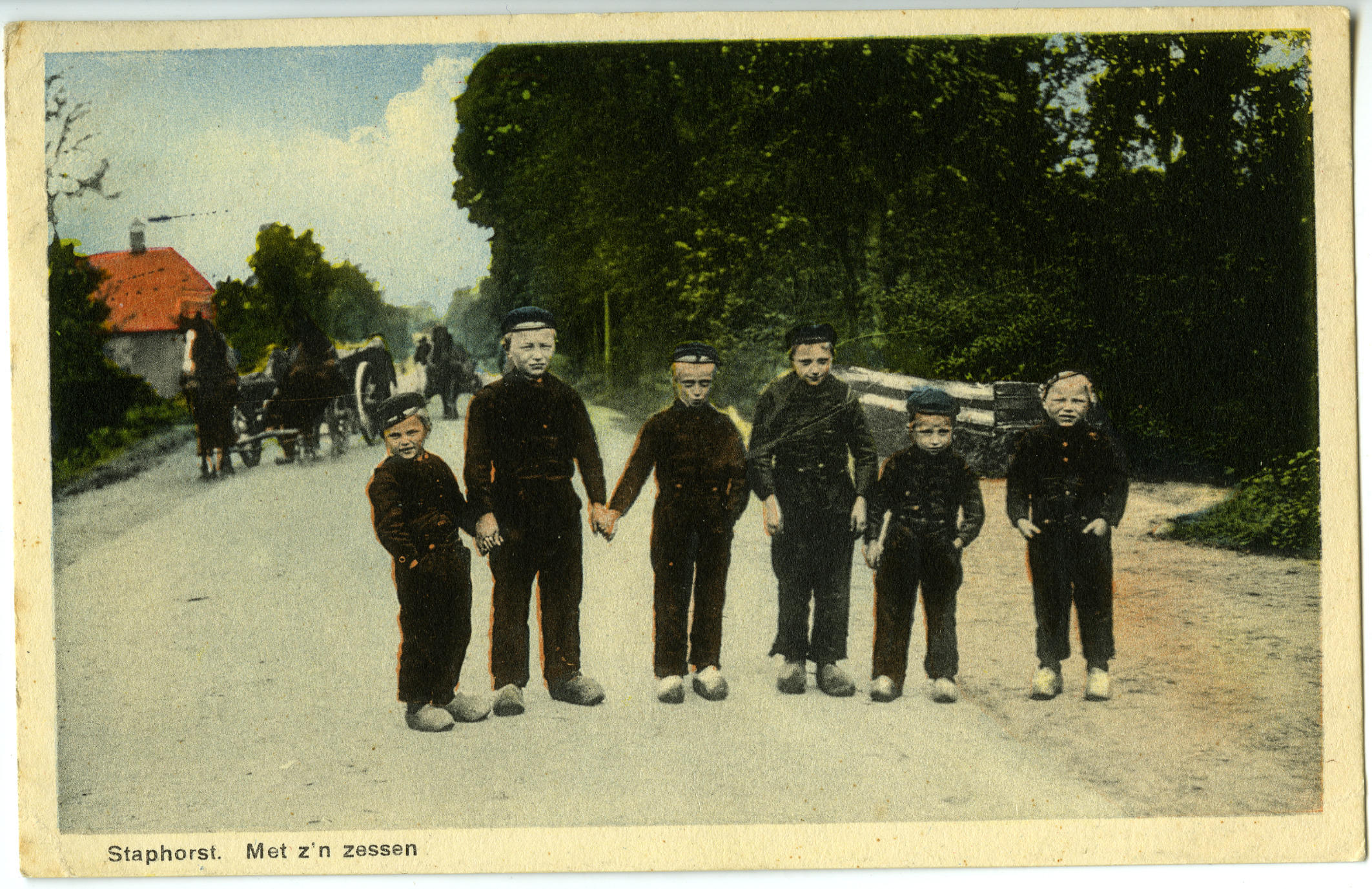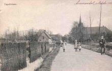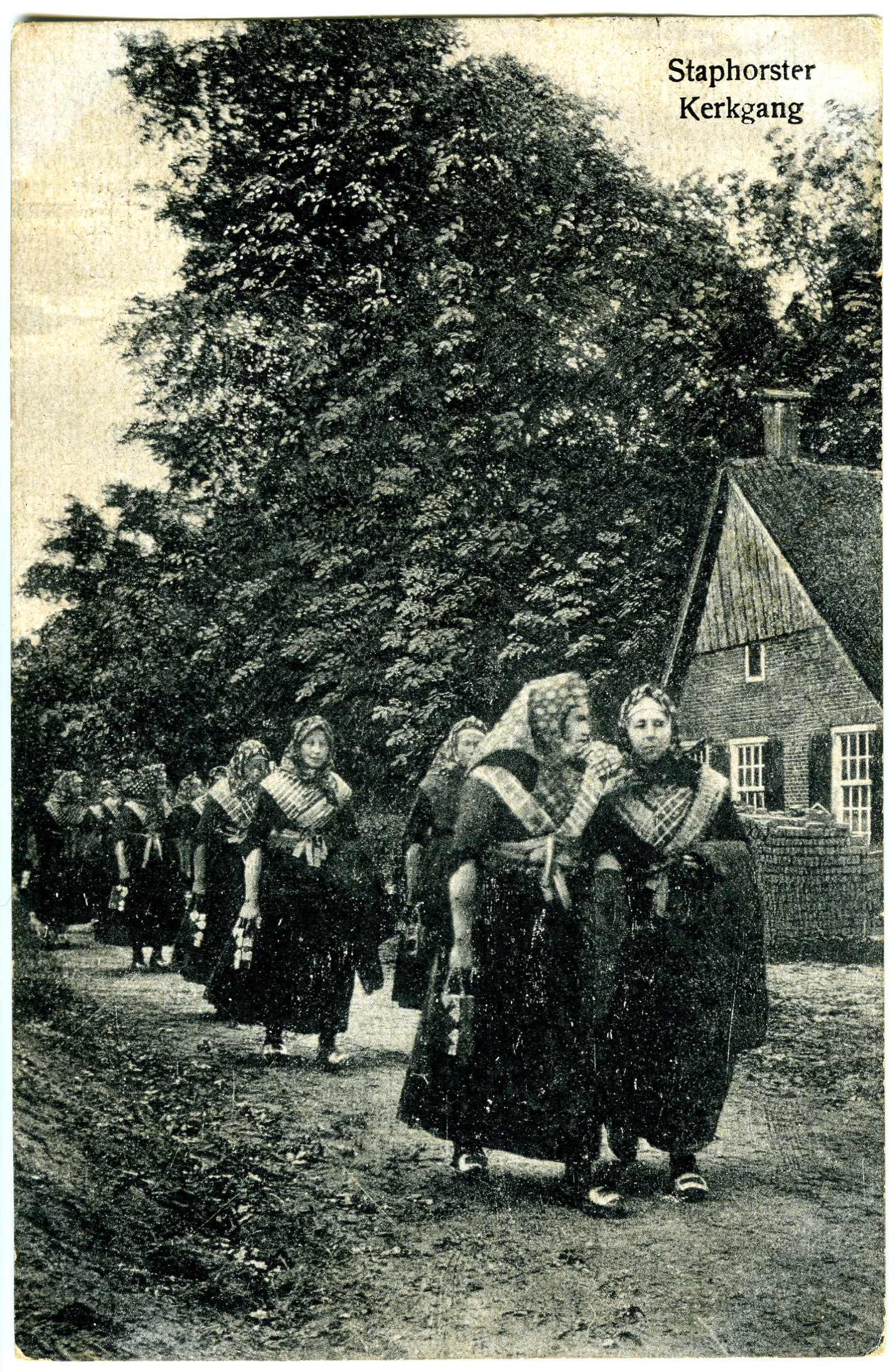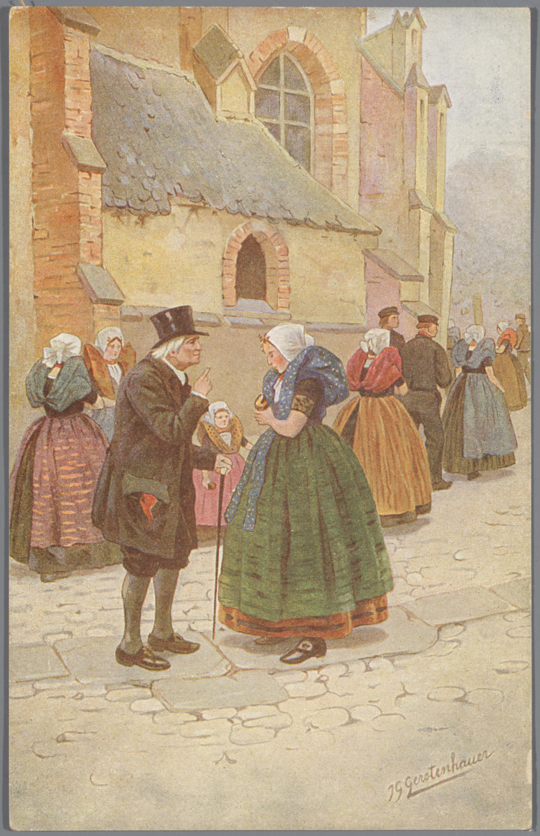 Mannen en vrouwen in zondagse Axelse dracht bij kerk...