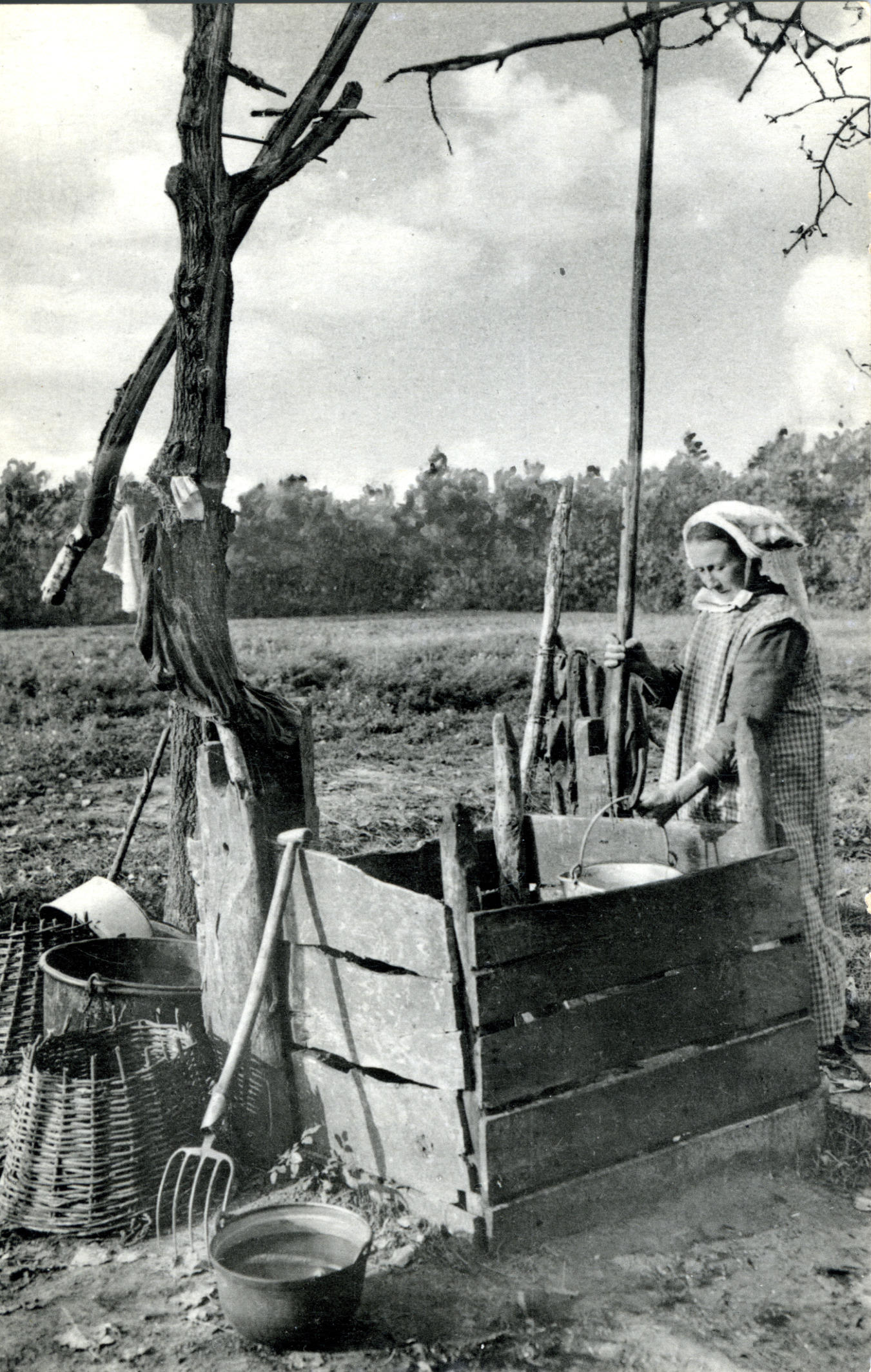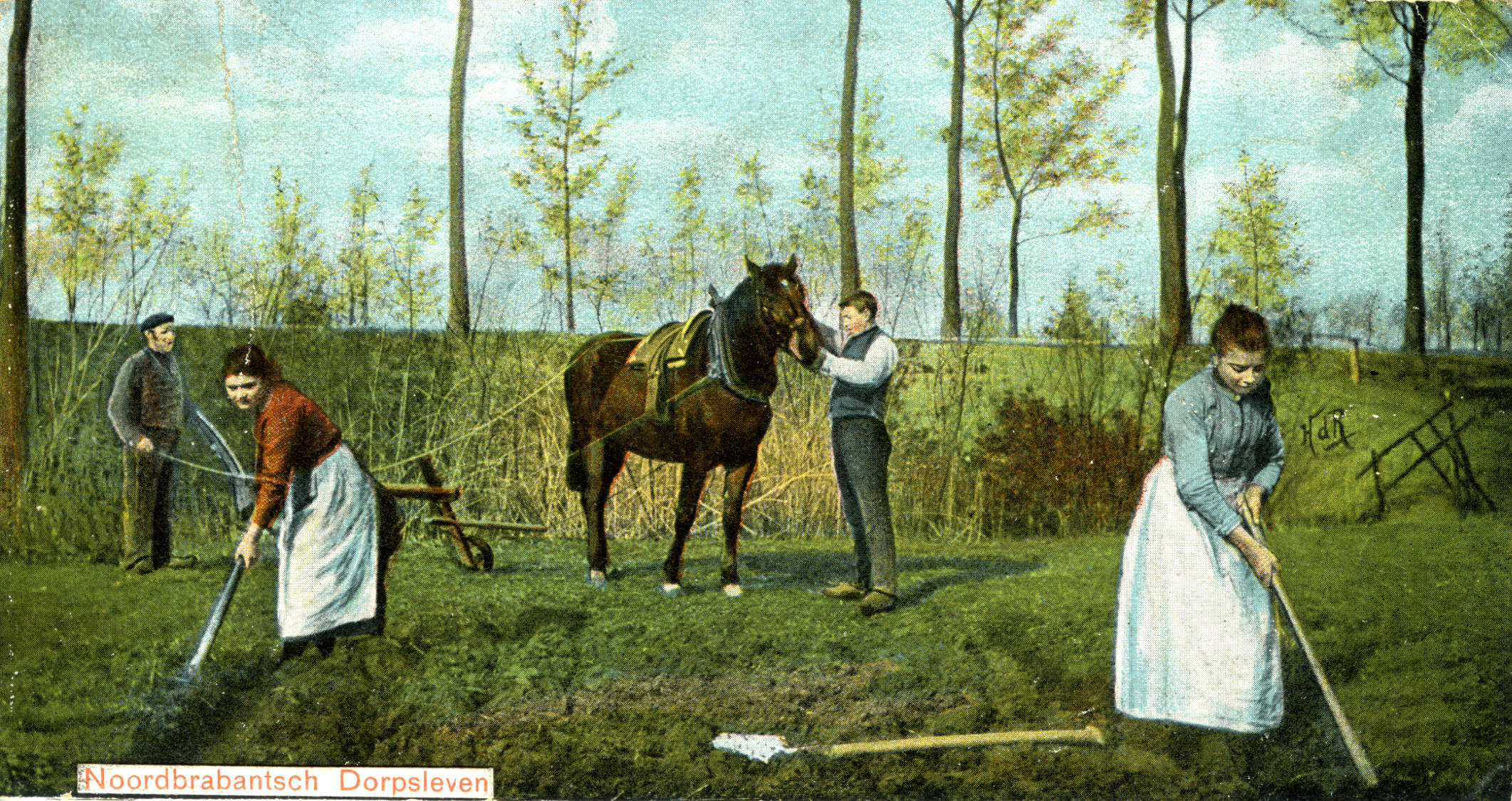Drie vrouwen in Noord-Brabantse dracht, gekleed in k...