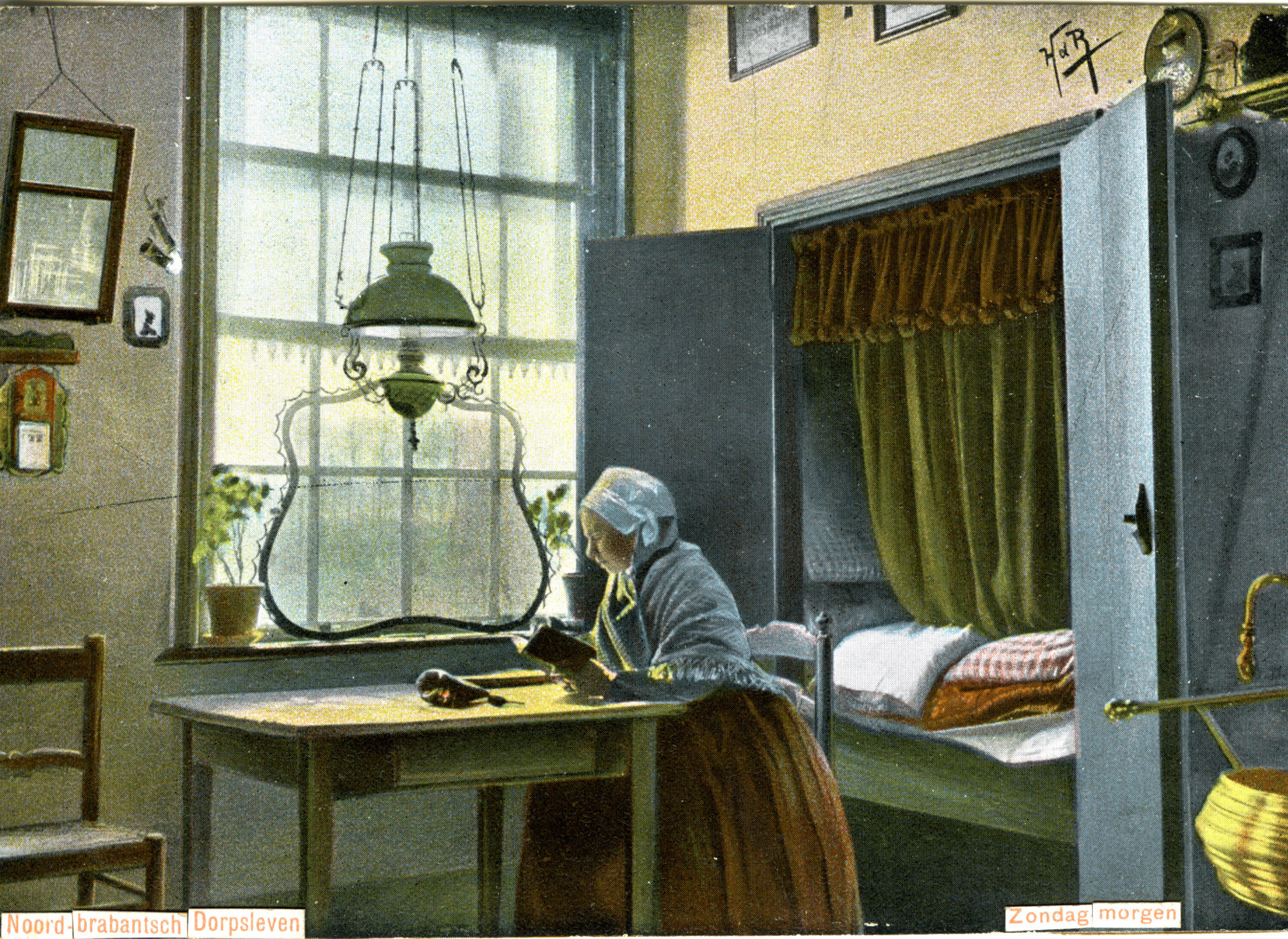 Vrouw en man in Noord-Brabantse dracht in interieur,...