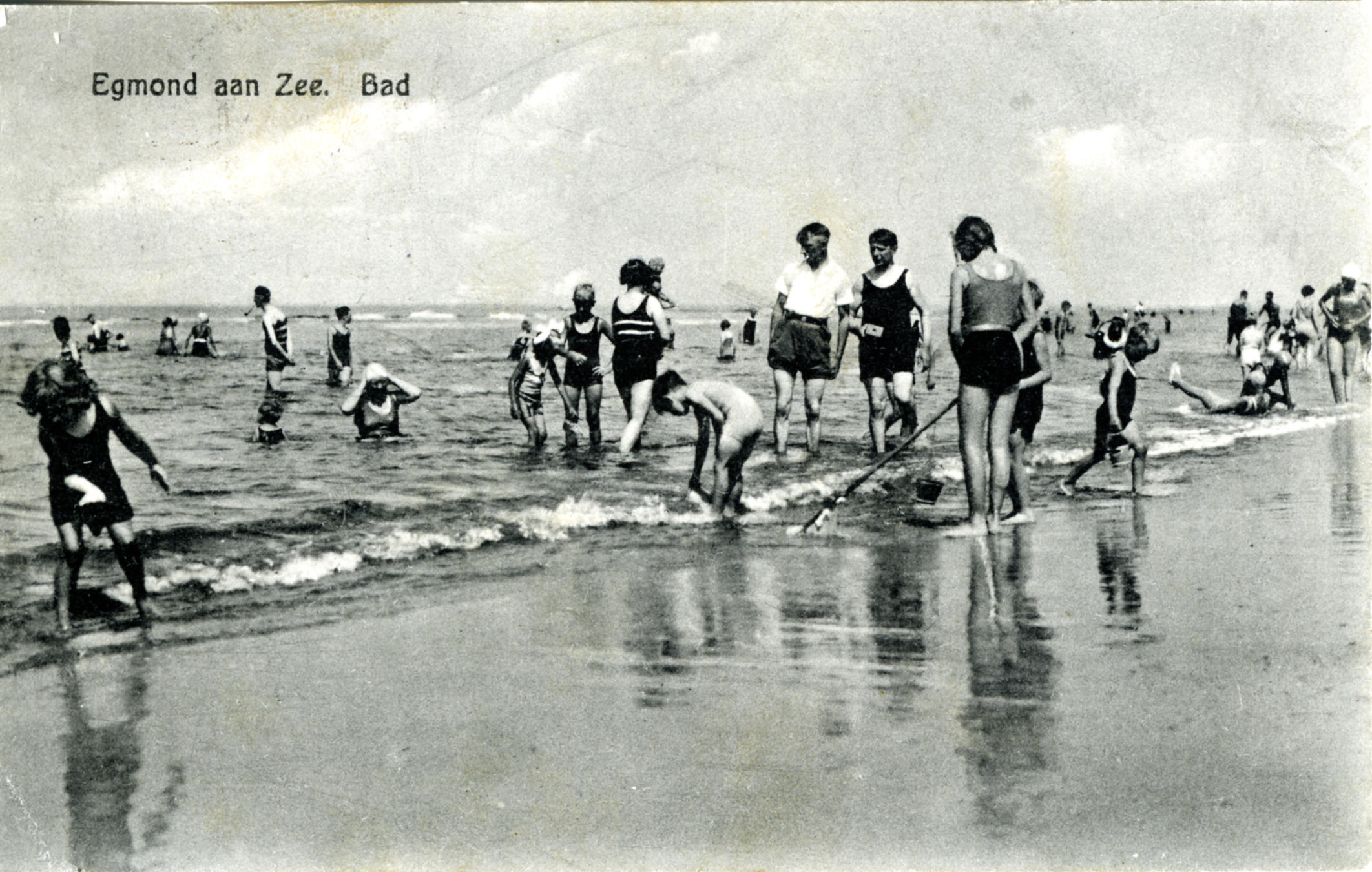 Badgasten op het strand bij Egmond aan Zee, voor jul...