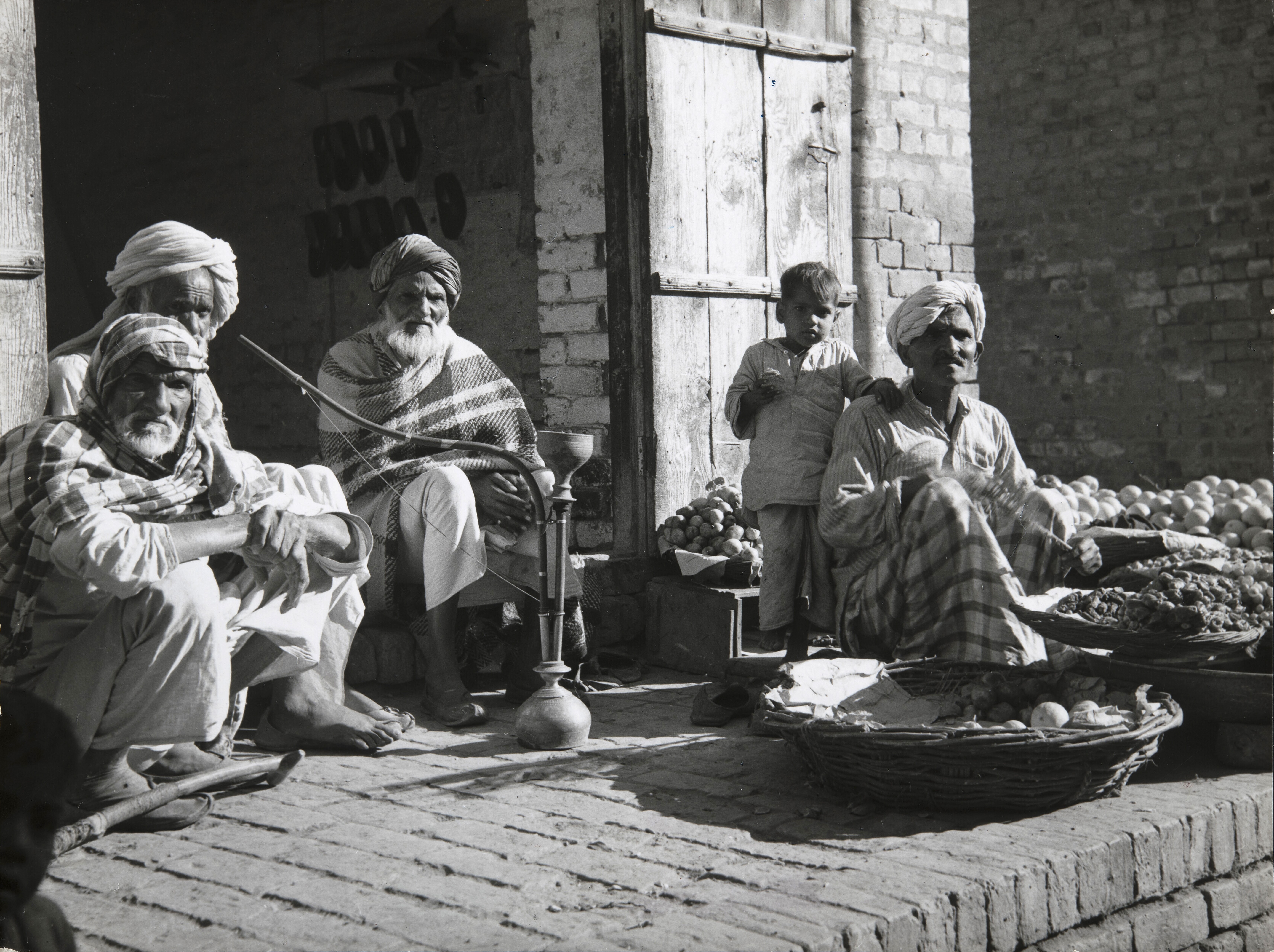 Straatbeeld met groepje mannen op twee banken, kinde...