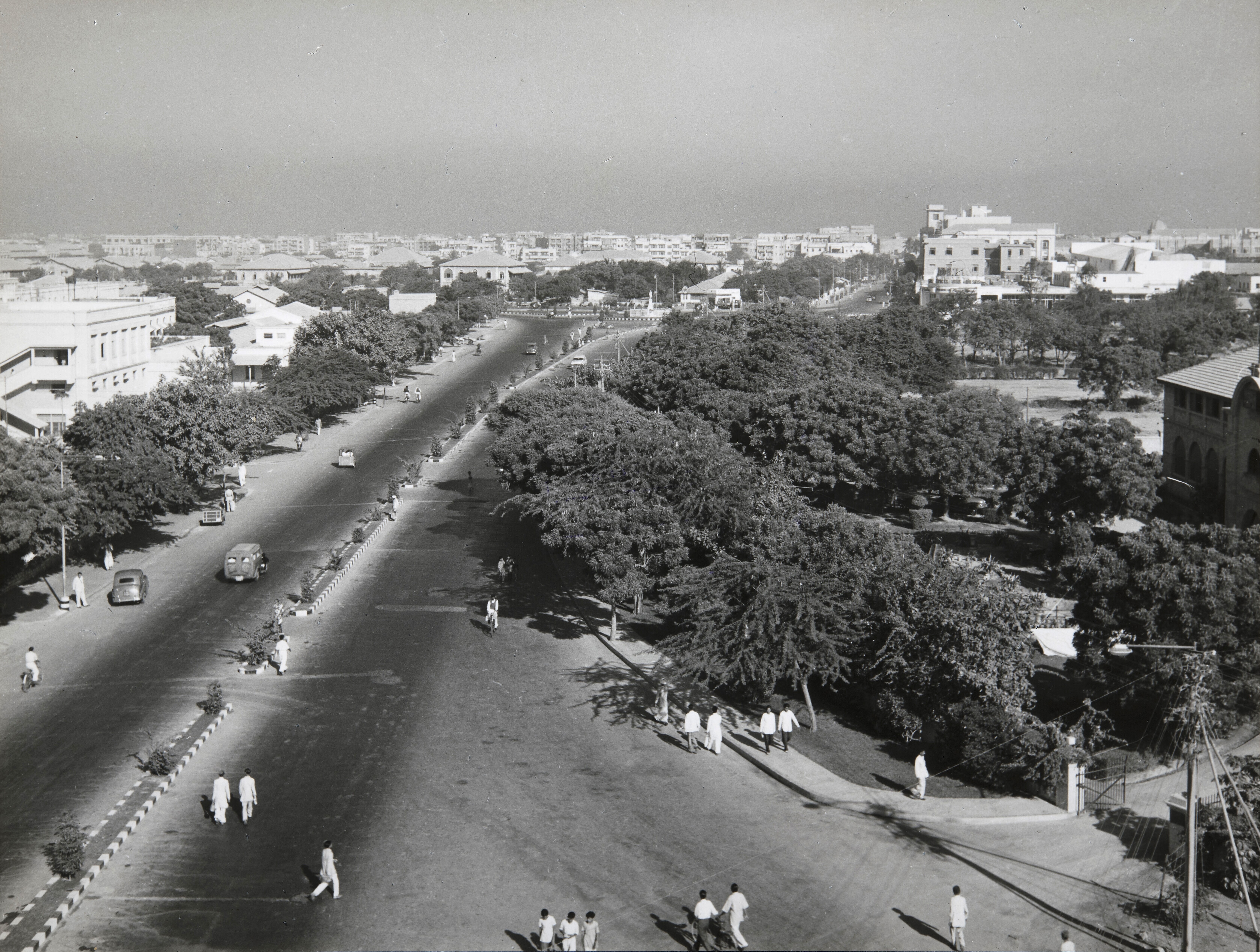 Overzichtsfoto van een grote stad, met brede weg waa...