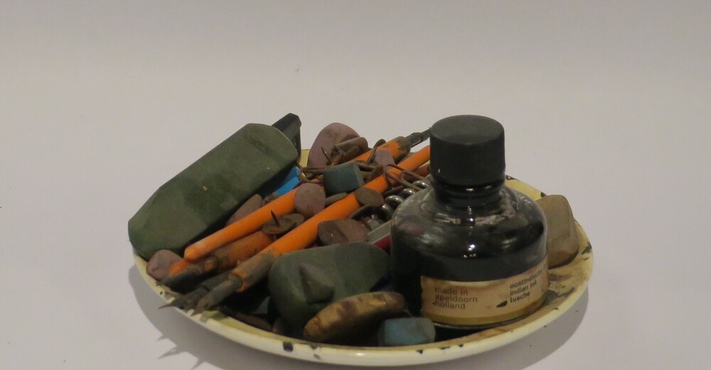Wit schoteltje met tekengereedschap en inkt