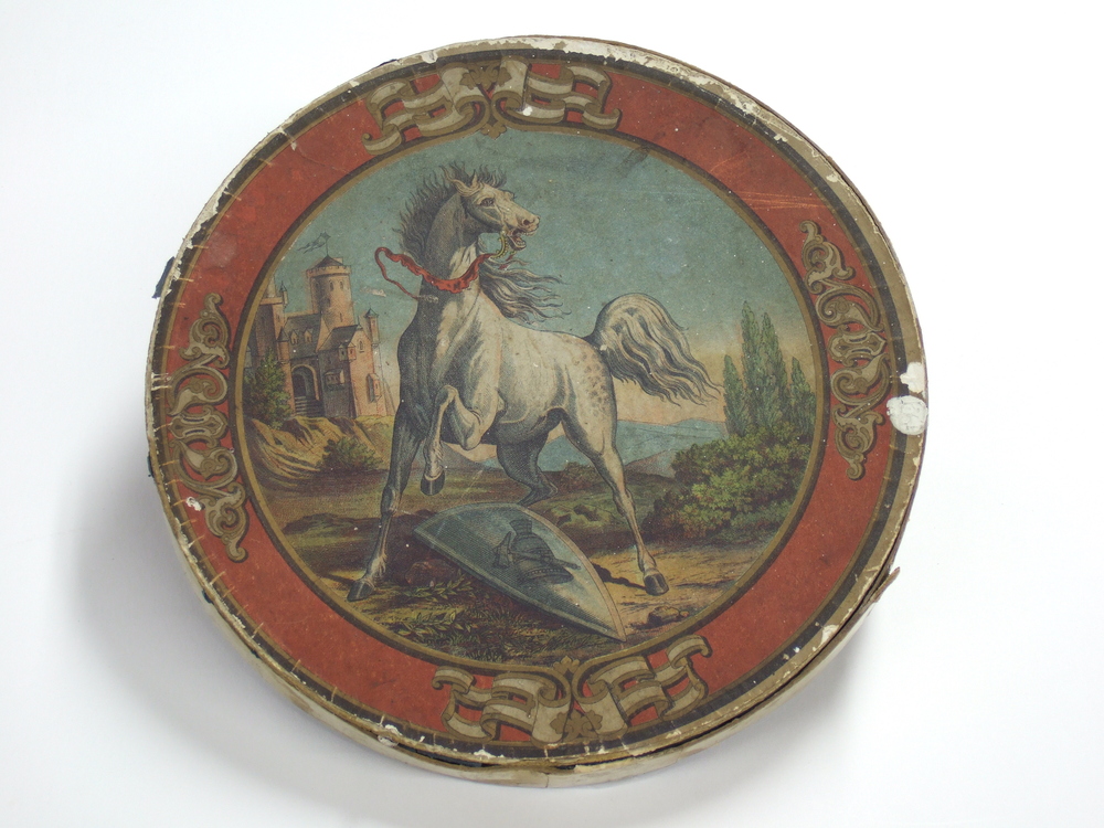 Klok en hamerspel in ronde doos, laat 19e eeuw.