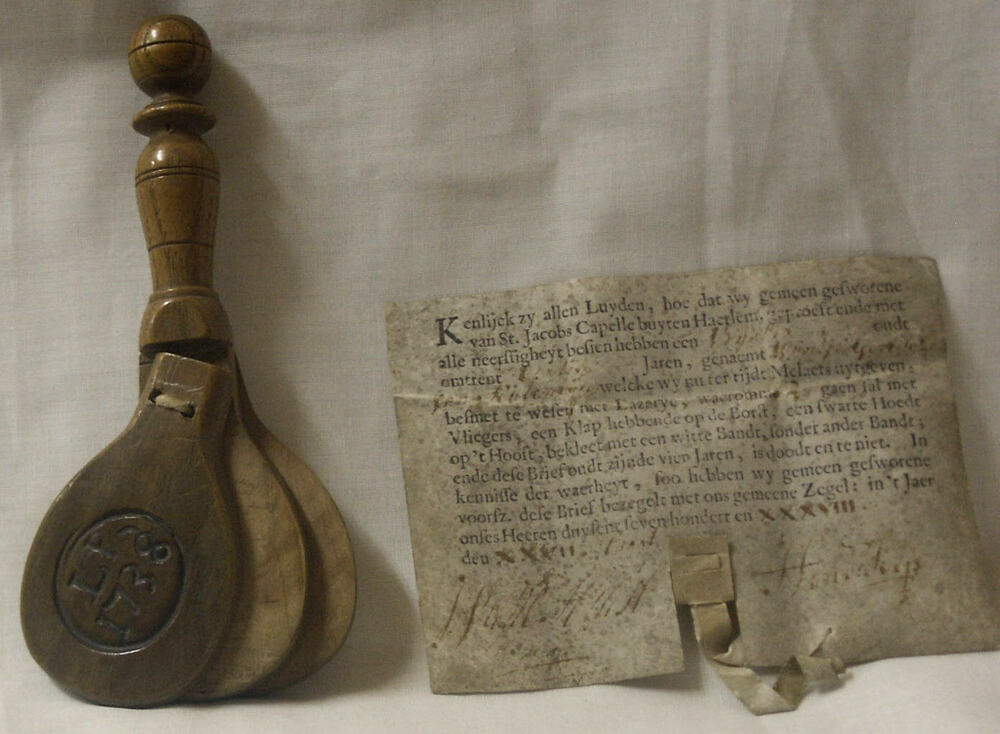 Lazarusklep van hout met oorkonde, gesigneerd, 1738