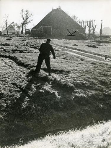 Foto in zwart-wit van het uitrijden van mest vanuit ...