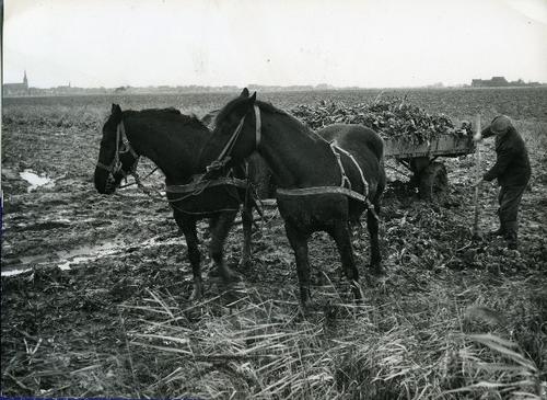 Foto in zwart-wit van het laden van bietenloof op ee...